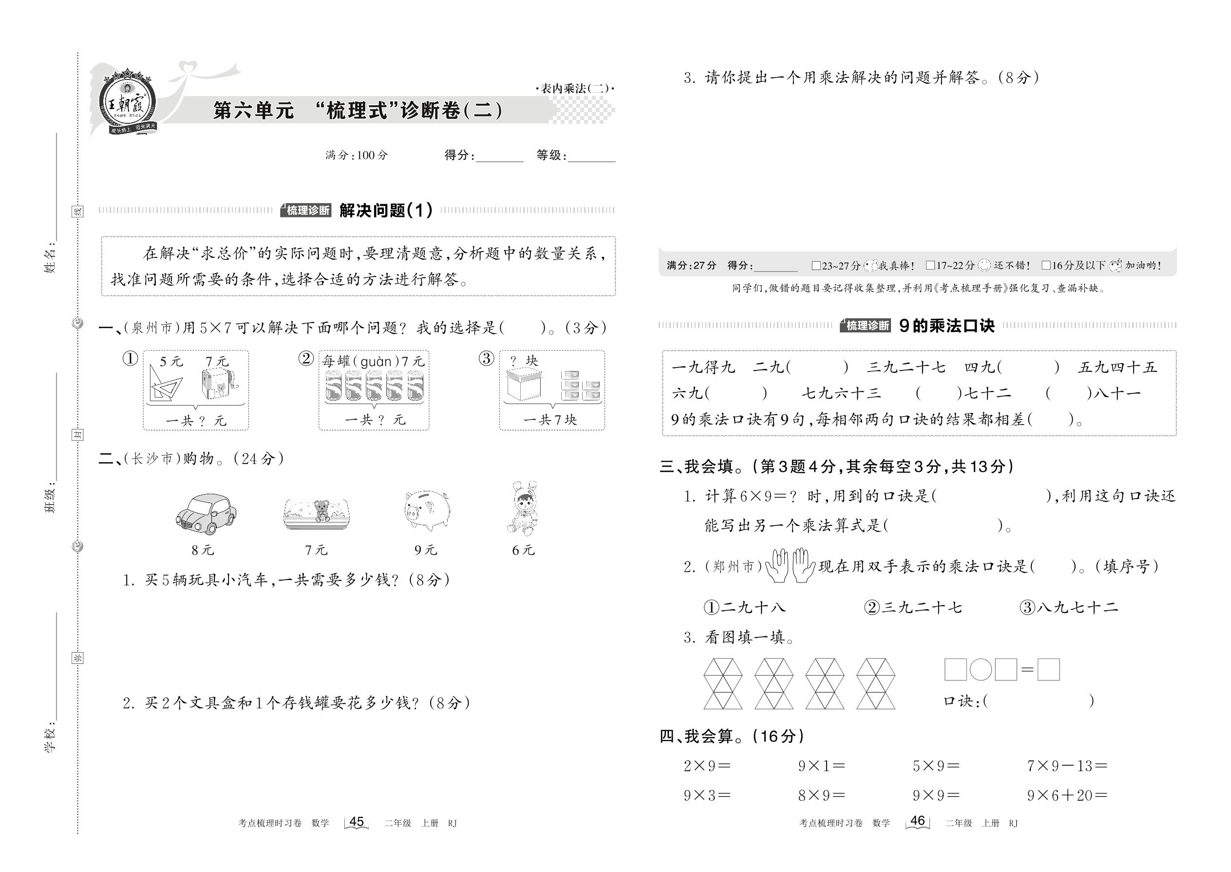 2022上册二年级数学人教版 第六单元 “梳理式”诊断卷(二)