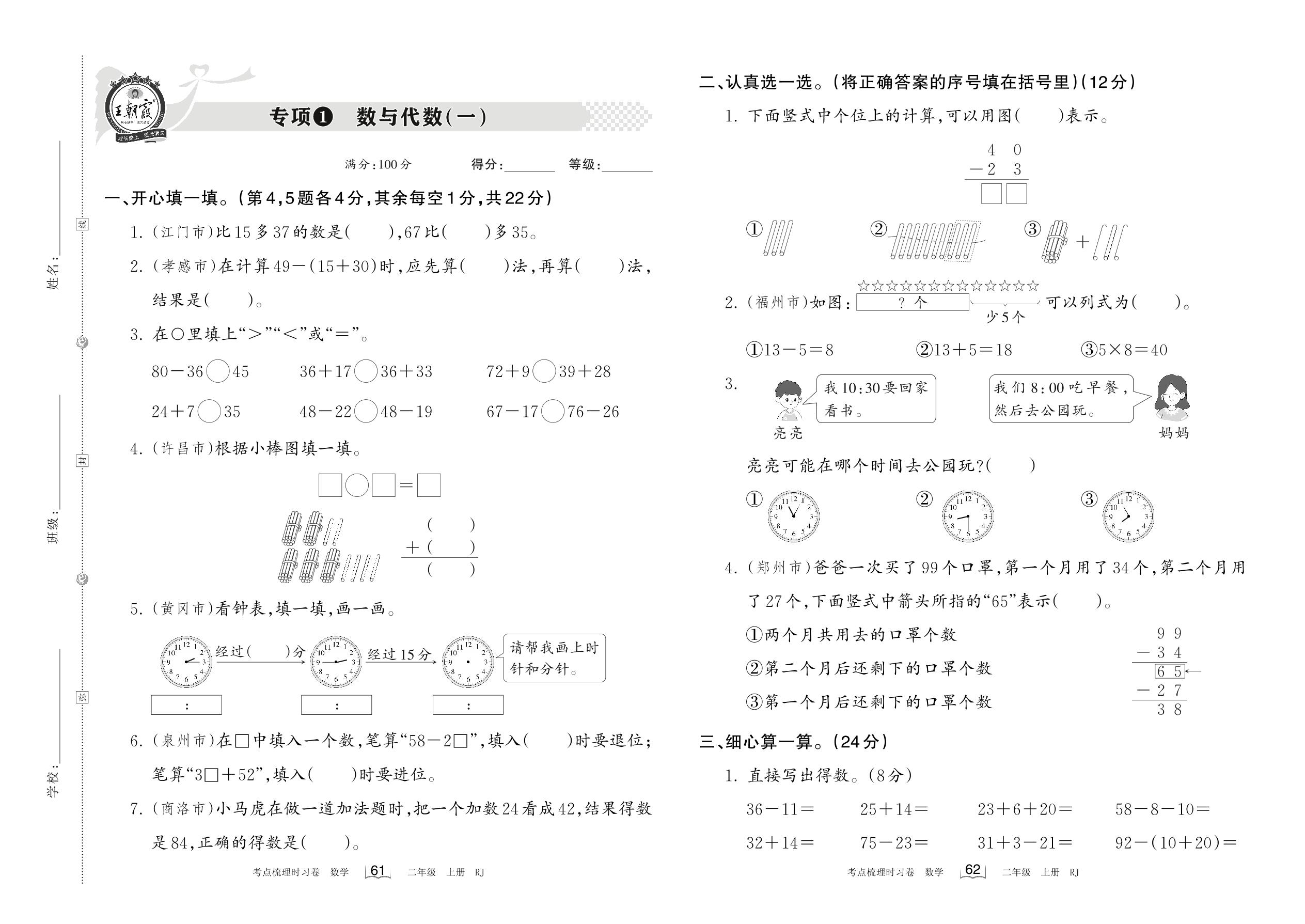2022上册二年级数学人教版 专项1 数与代数(一)