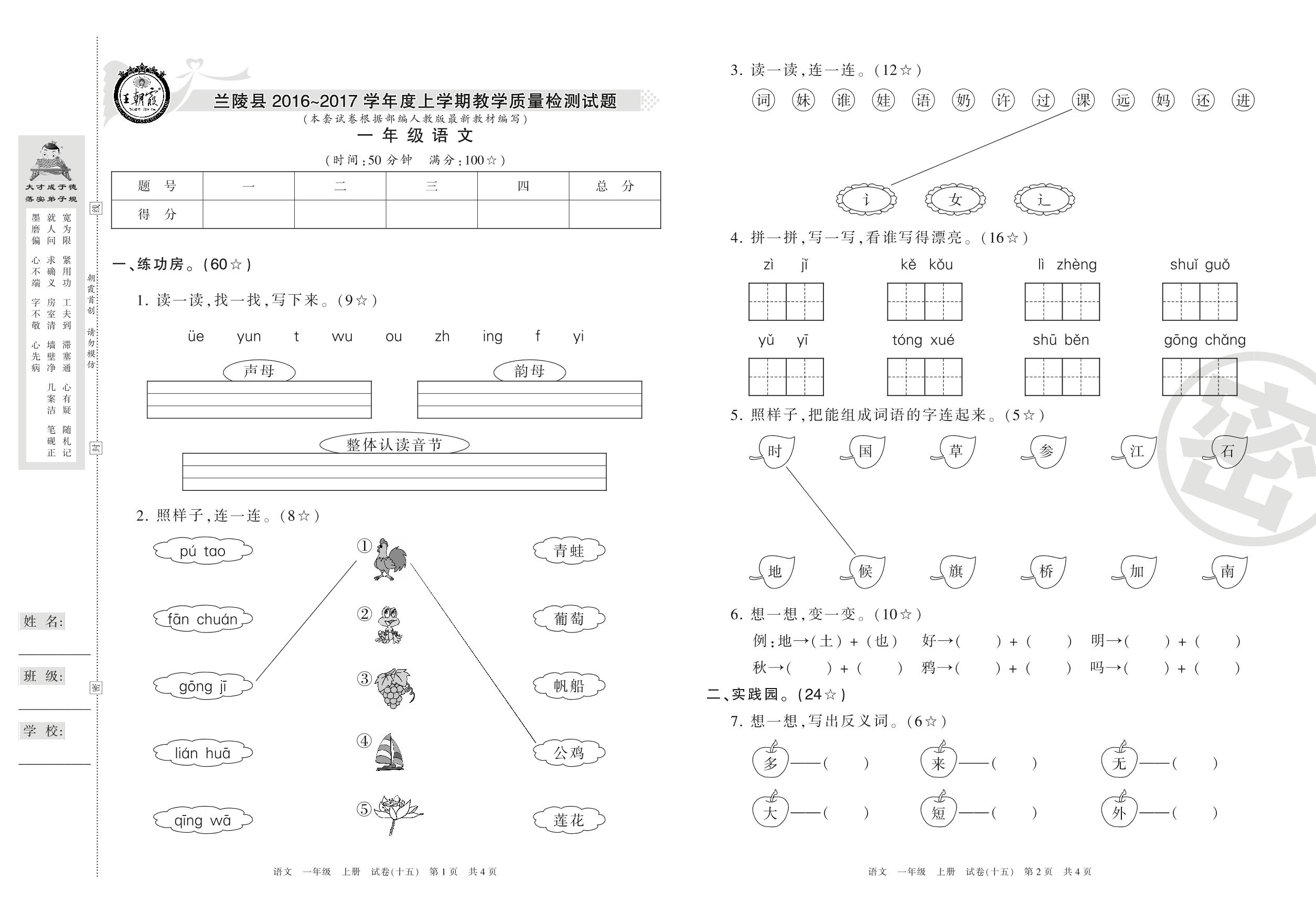 2016-2017学年第一学期临沂市兰陵县一年级语文试卷(人教版)【15】