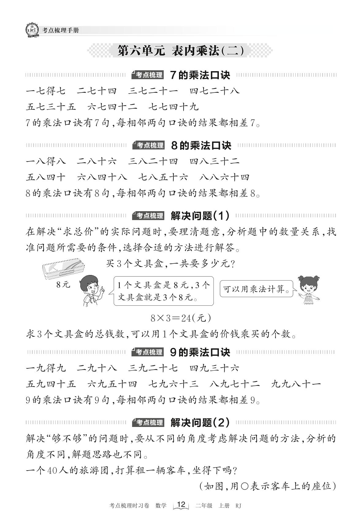 2022上册二年级数学人教版 考点梳理手册——第六单元 表内乘法(二)