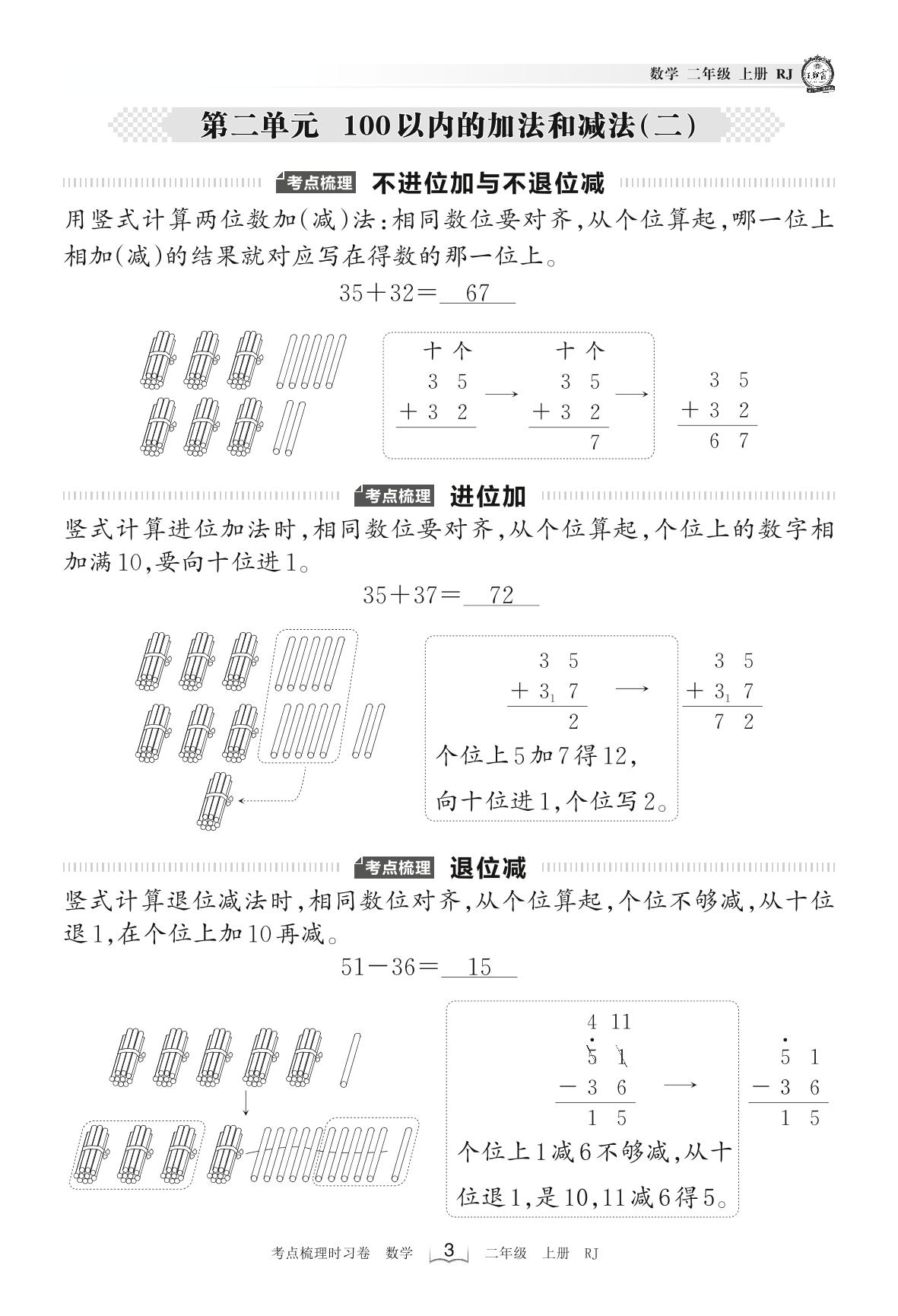 2022上册二年级数学人教版 考点梳理手册——第二单元 100以内的加法和减法(二)