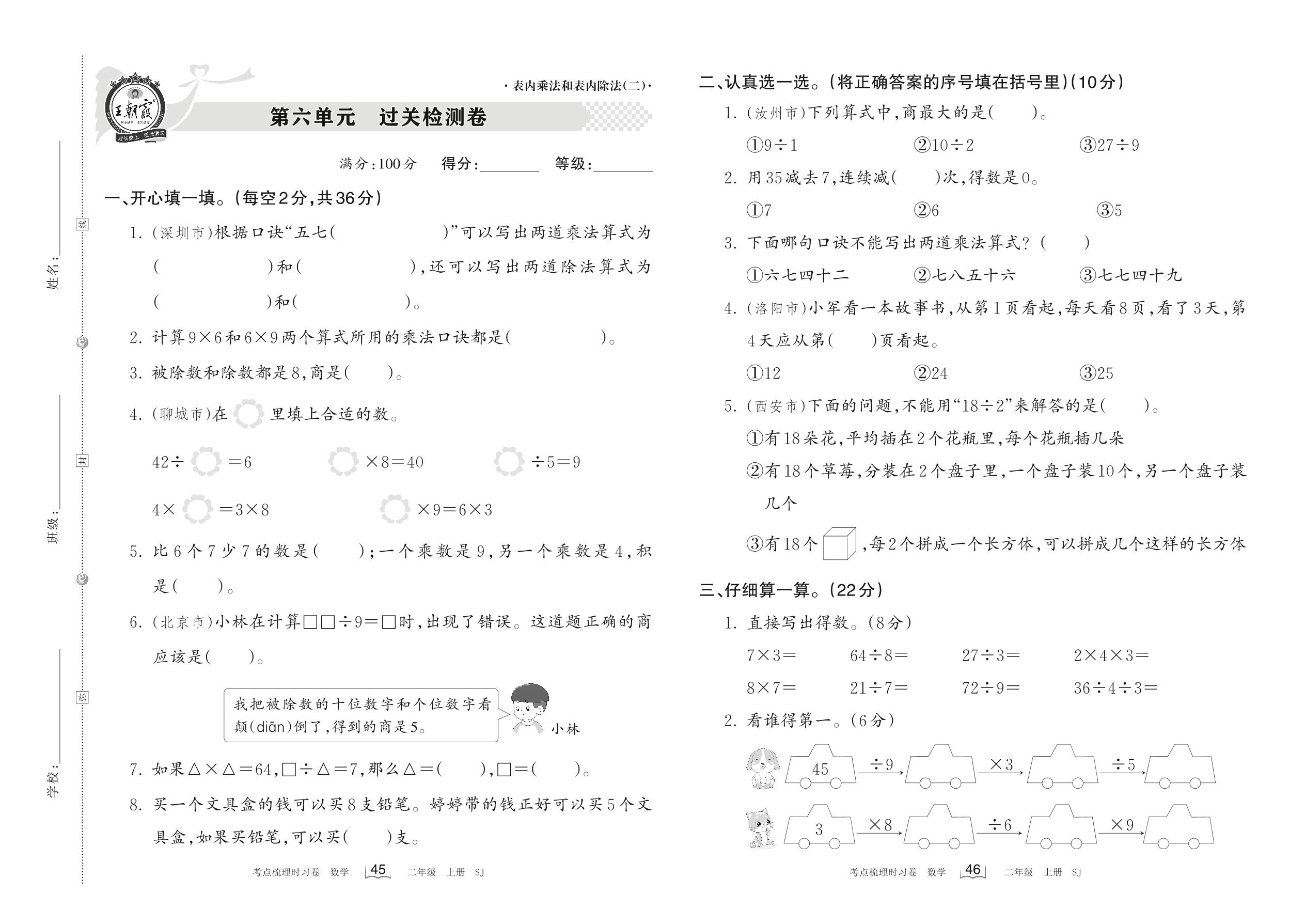 2022上册二年级数学苏教版 第六单元 过关检测卷