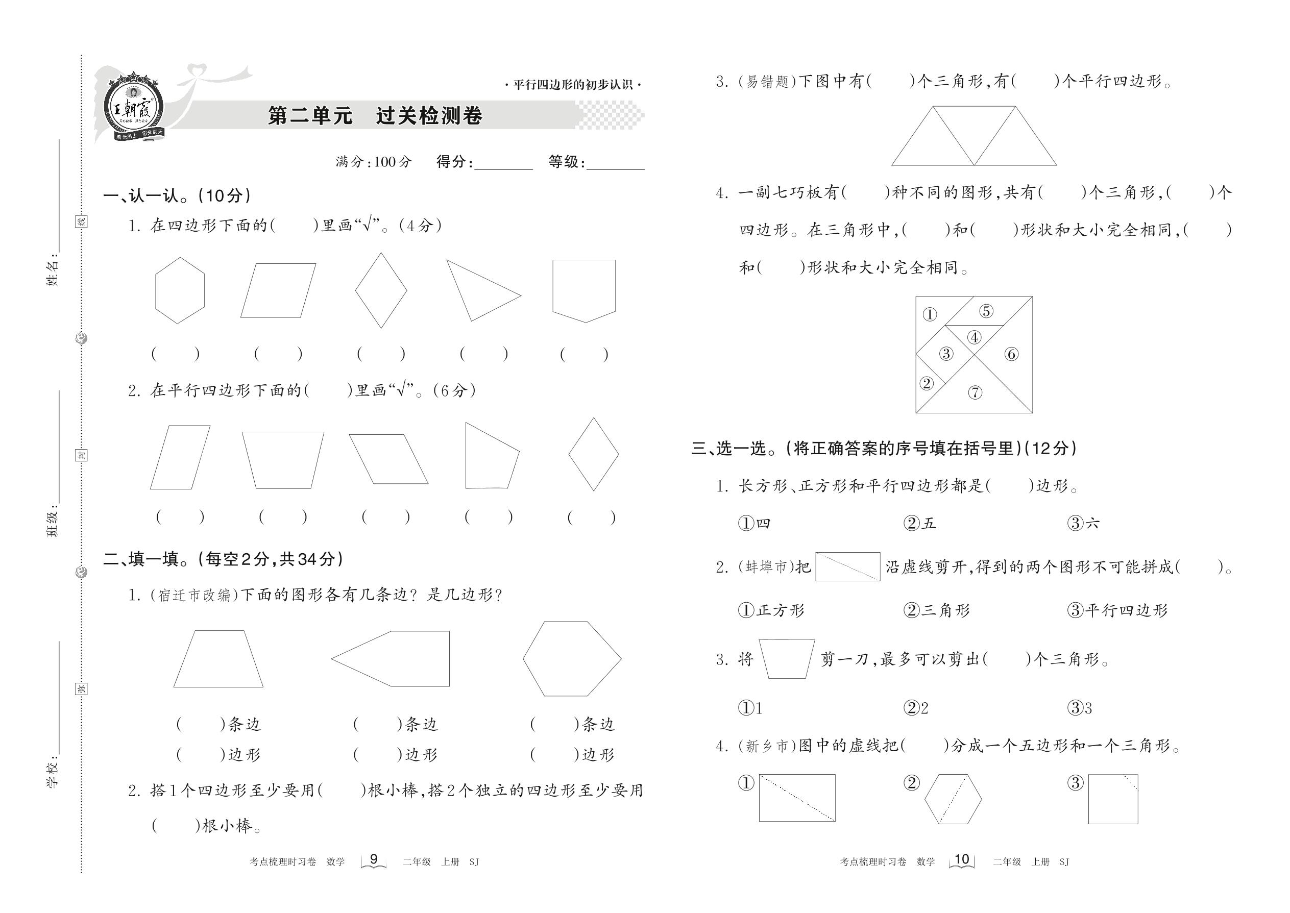 2022上册二年级数学苏教版 第二单元 过关检测卷