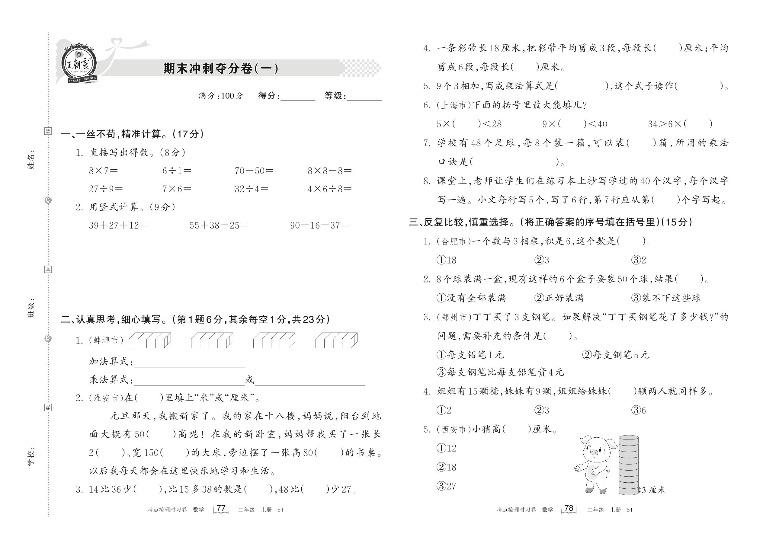 2022上册二年级数学苏教版 期末冲刺夺分卷(一)