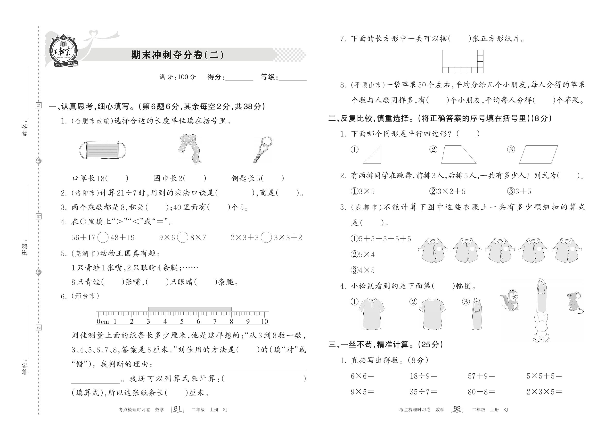 二年级数学苏教版上册期末卷