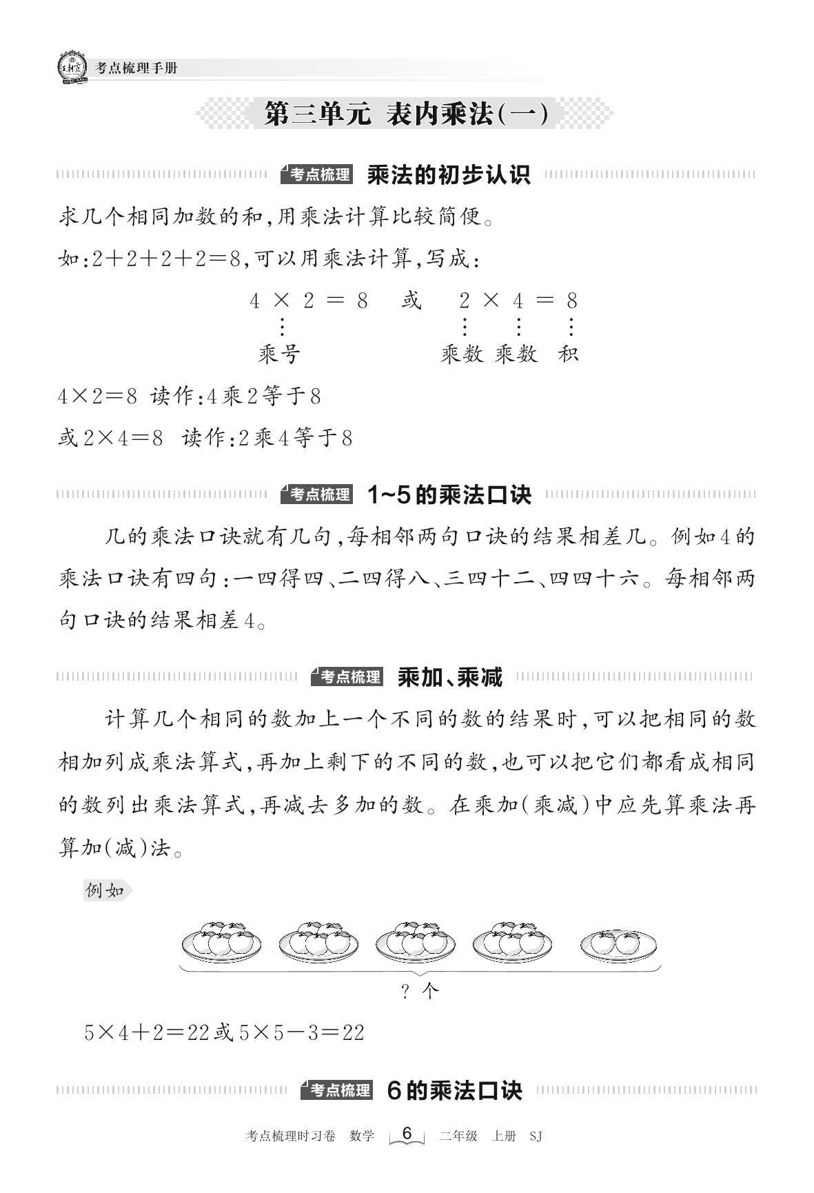 2022上册二年级数学苏教版 考点梳理手册——第三单元 表内乘法(一)