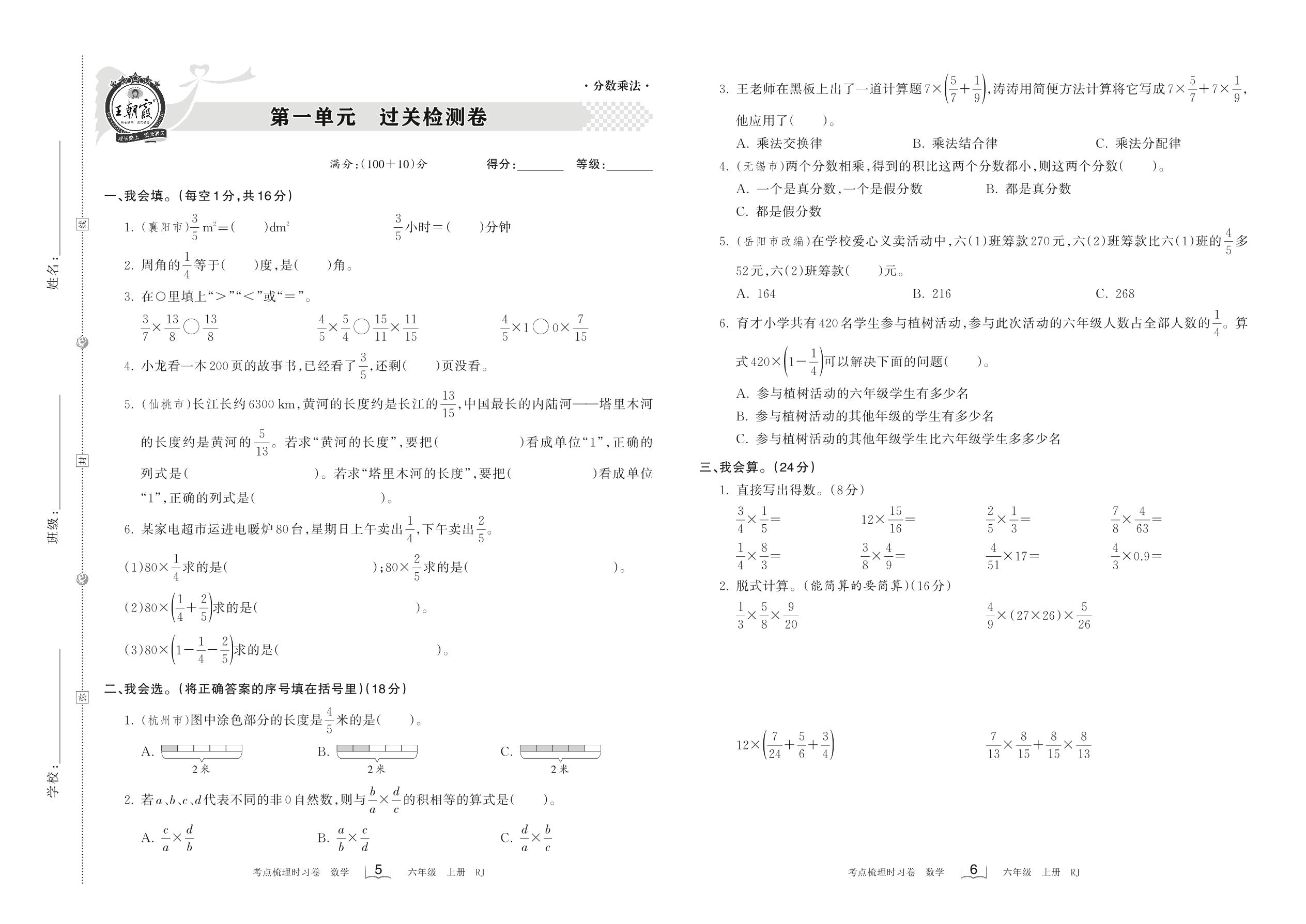 2022上册六年级数学人教版 第一单元 过关检测卷