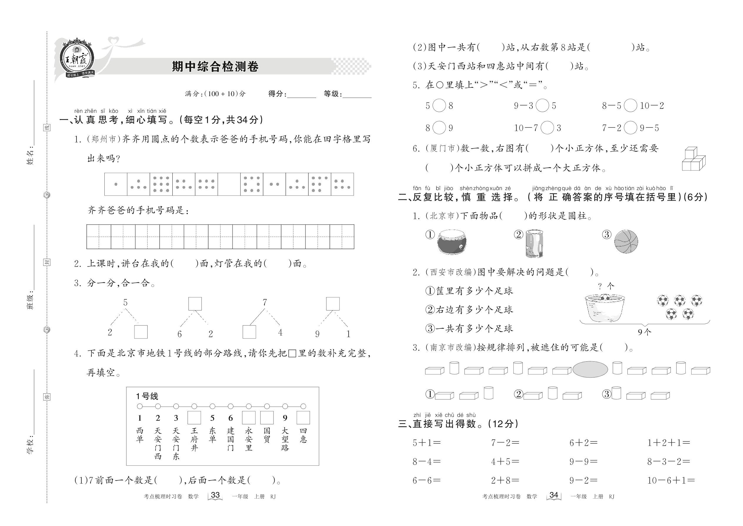 一年级数学人教版上册期中卷
