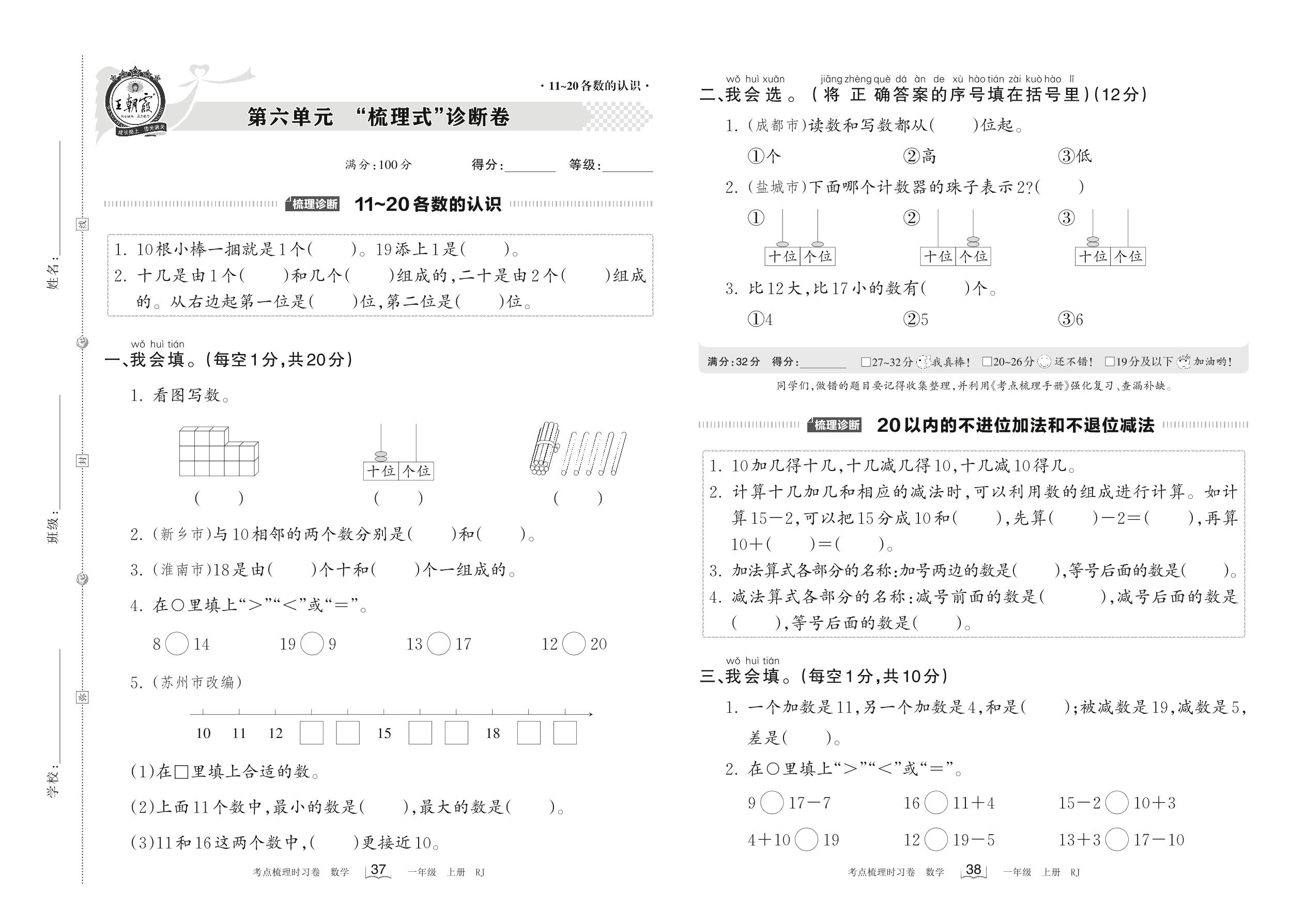 2022上册一年级数学人教版 第六单元 “梳理式”诊断卷