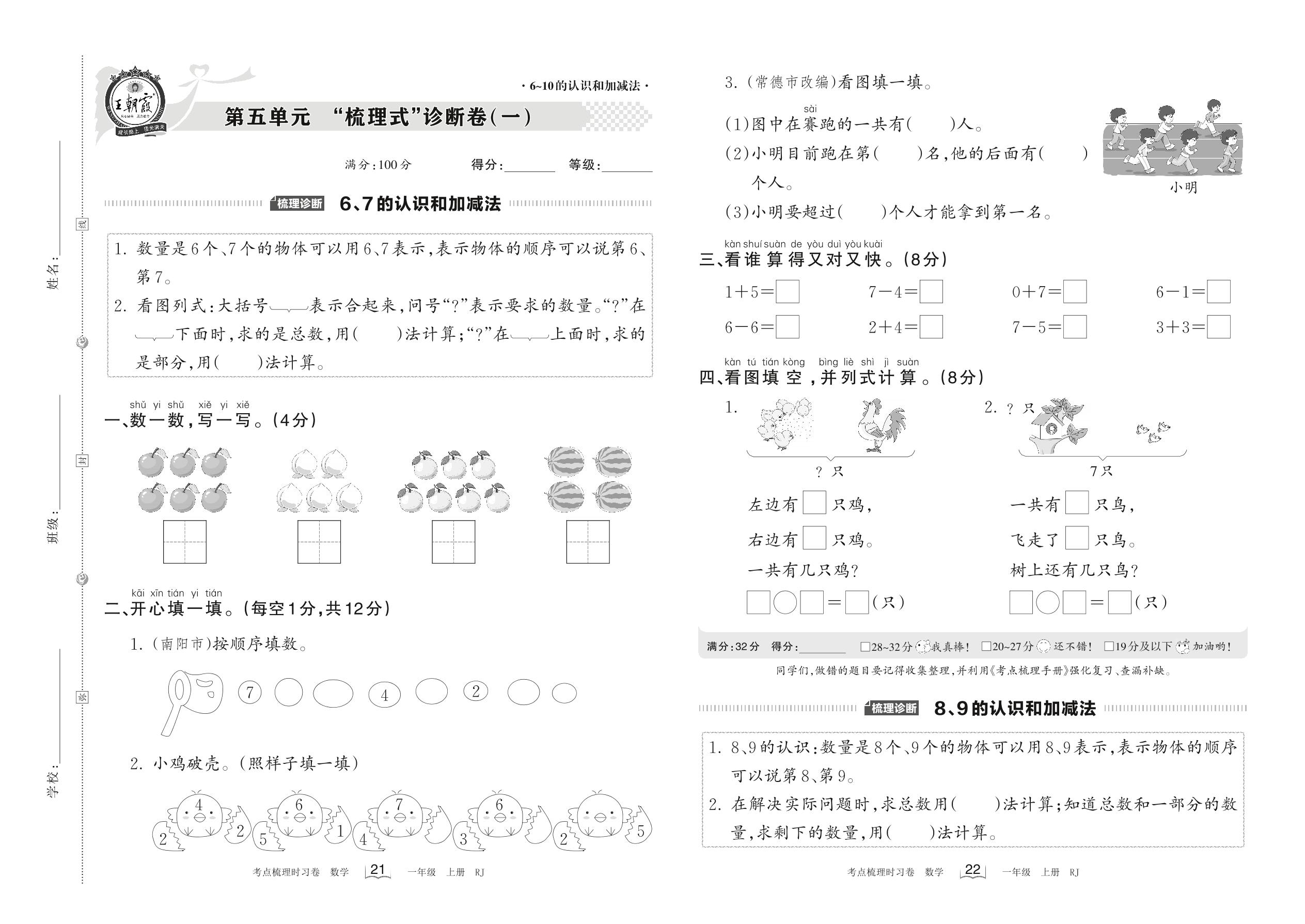 2022上册一年级数学人教版 第五单元 “梳理式”诊断卷(一)