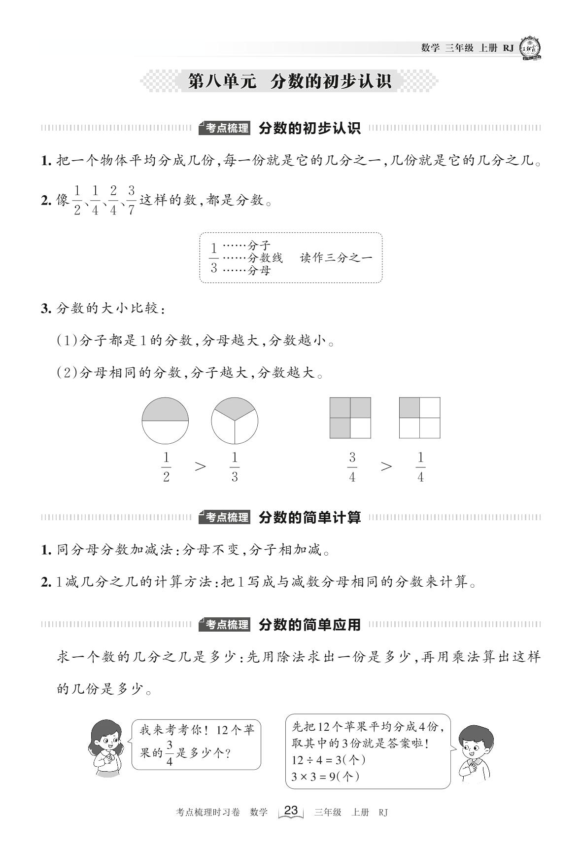 2022上册三年级数学人教版 考点梳理手册——第八单元 分数的初步认识