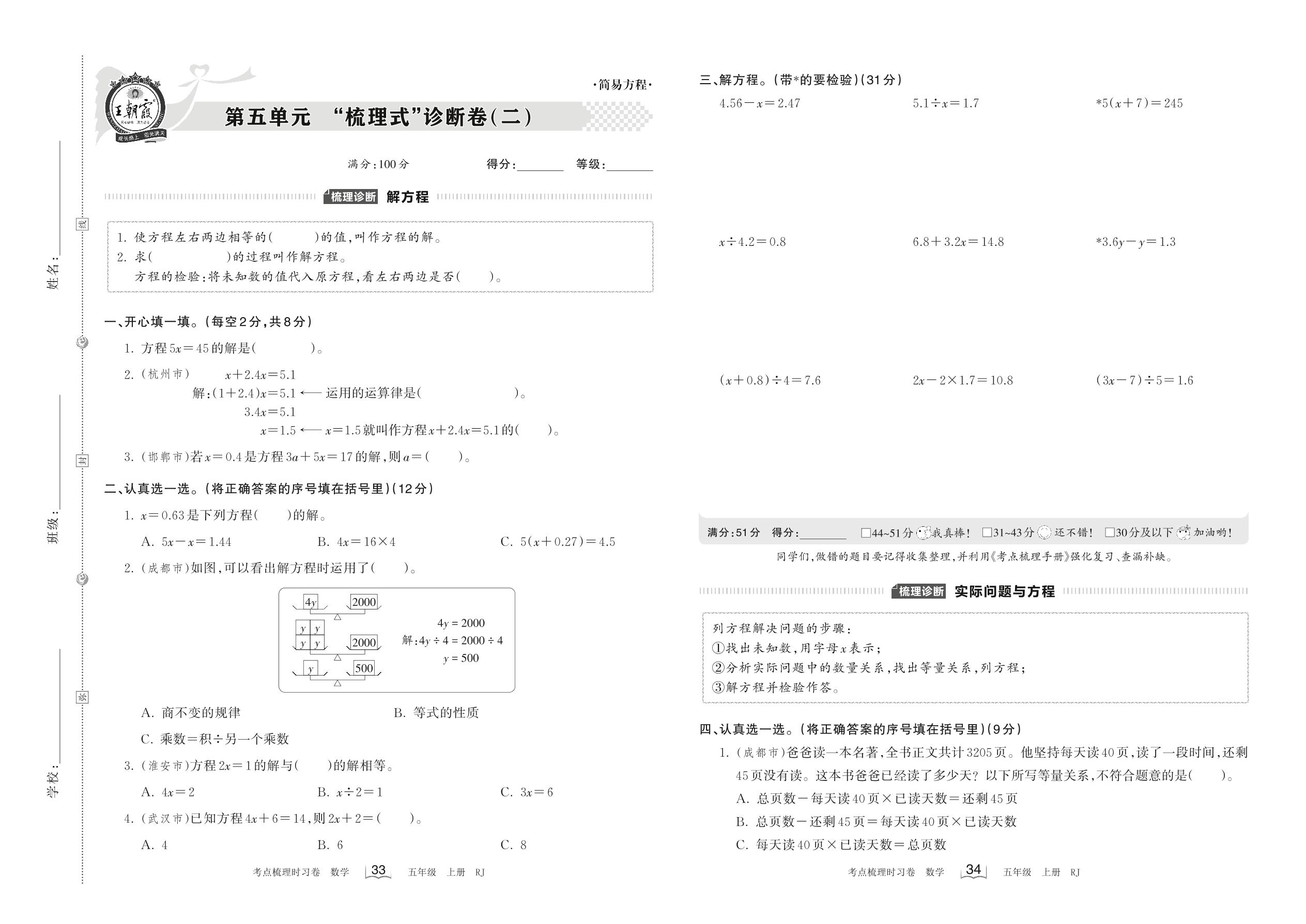 2022上册五年级数学人教版 第五单元 “梳理式”诊断卷(二)