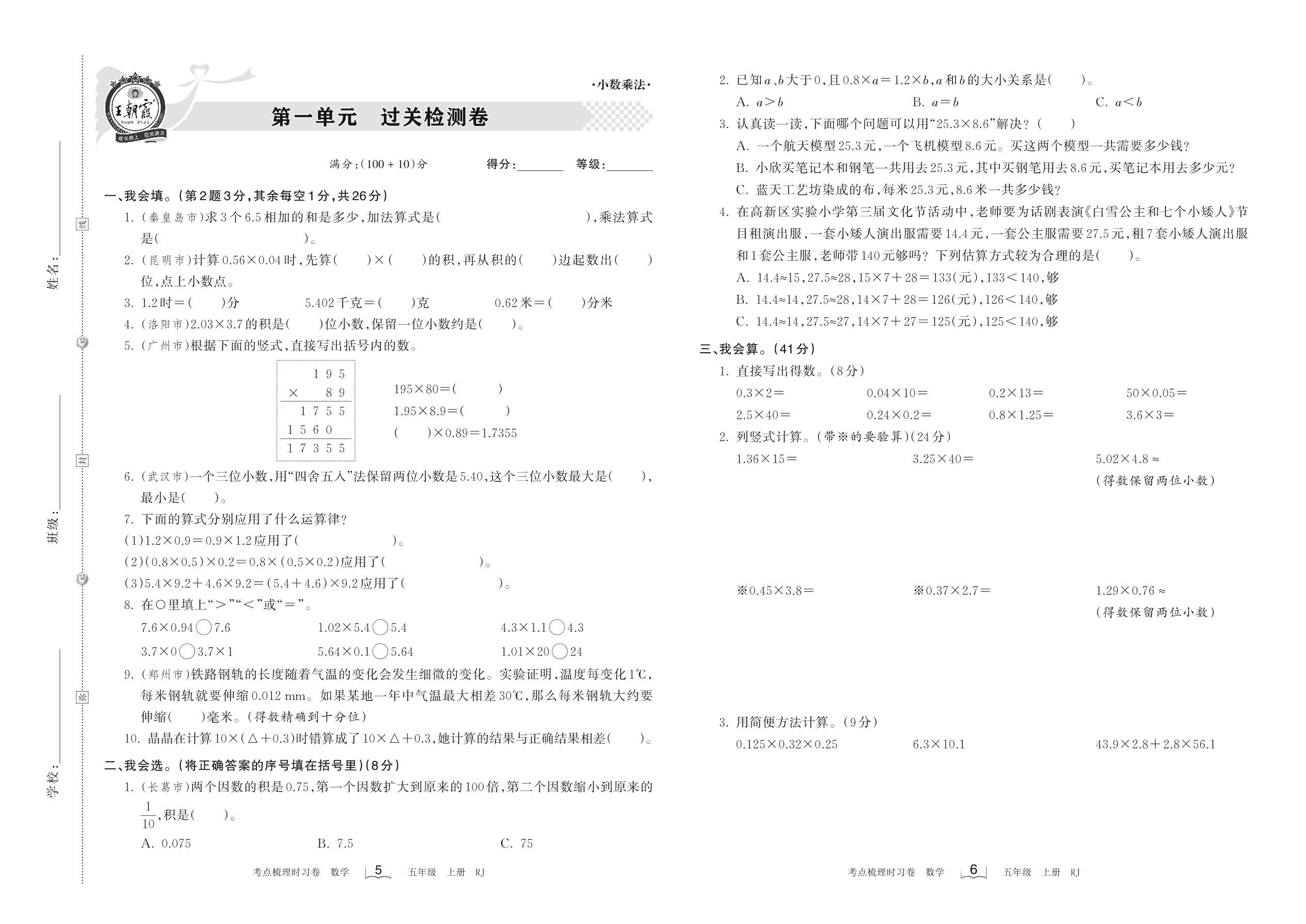 2022上册五年级数学人教版 第一单元 过关检测卷