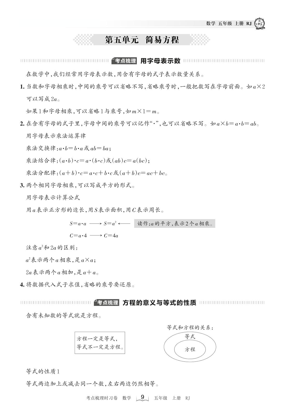 2022上册五年级数学人教版 考点梳理手册——第五单元 简易方程