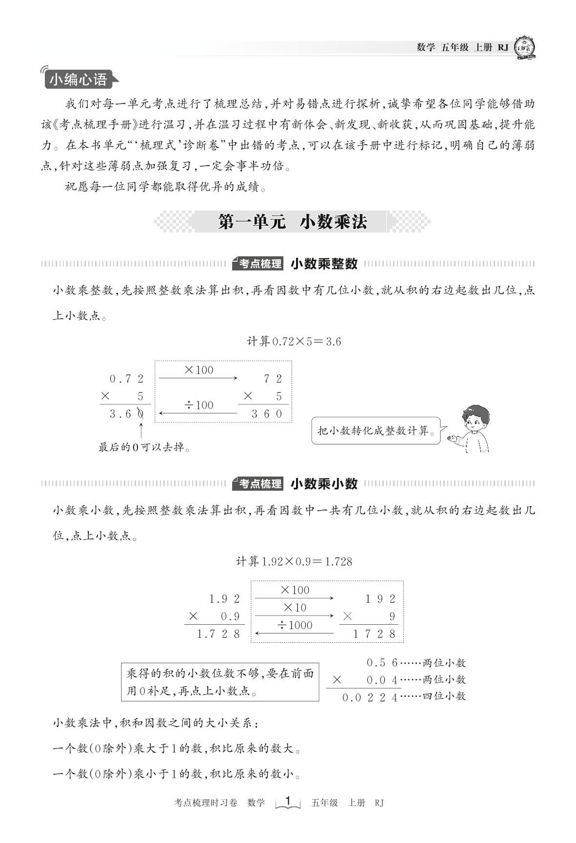 2022上册五年级数学人教版 考点梳理手册——第一单元 小数乘法