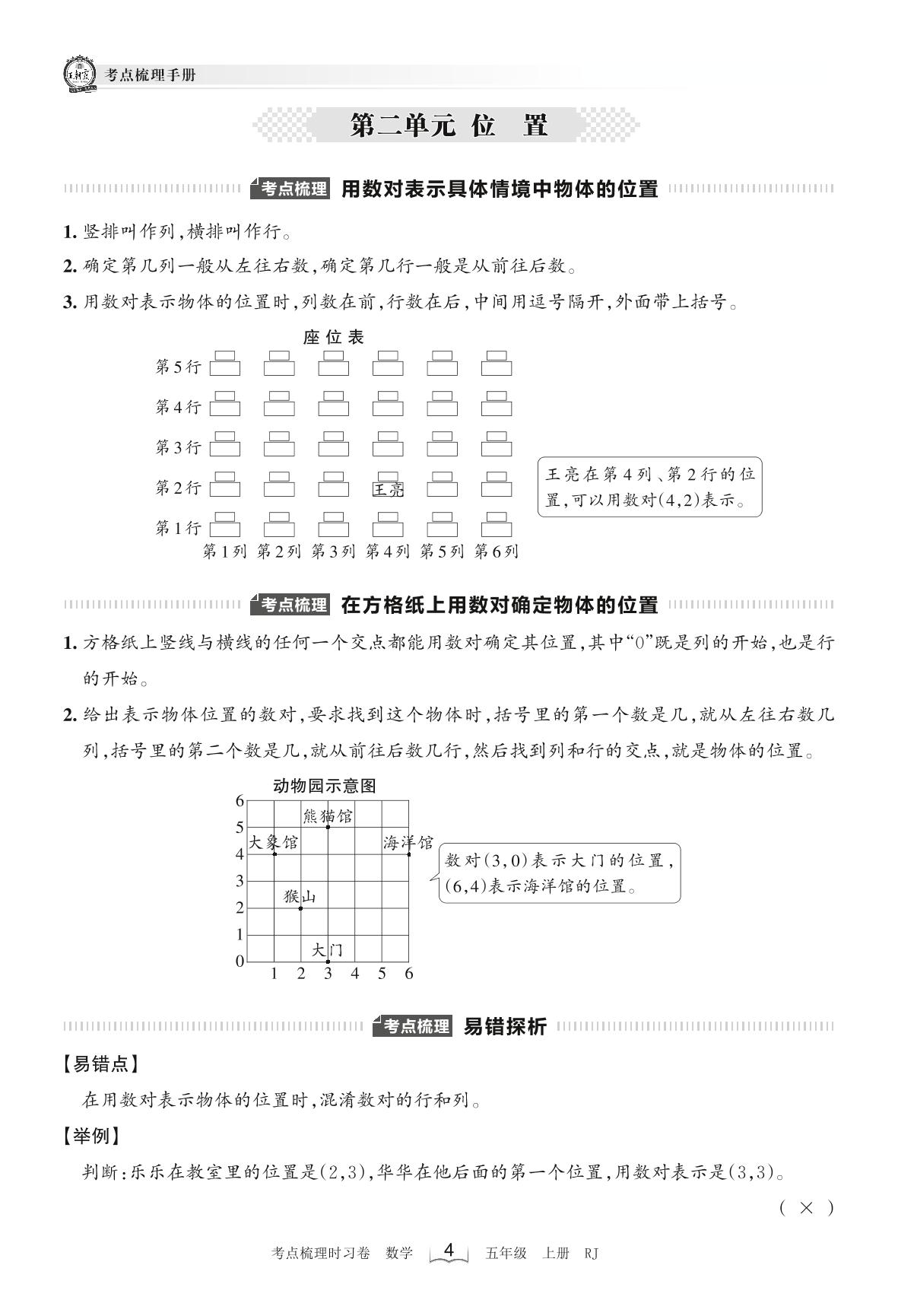 2022上册五年级数学人教版 考点梳理手册——第二单元 位置