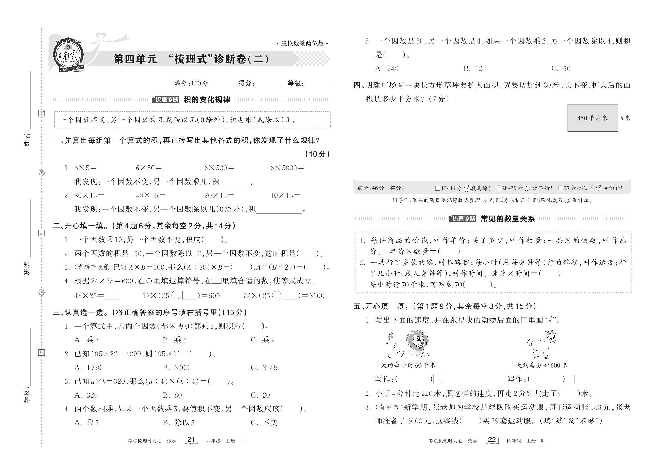 2022上册四年级数学人教版 第四单元 “梳理式”诊断卷(二)