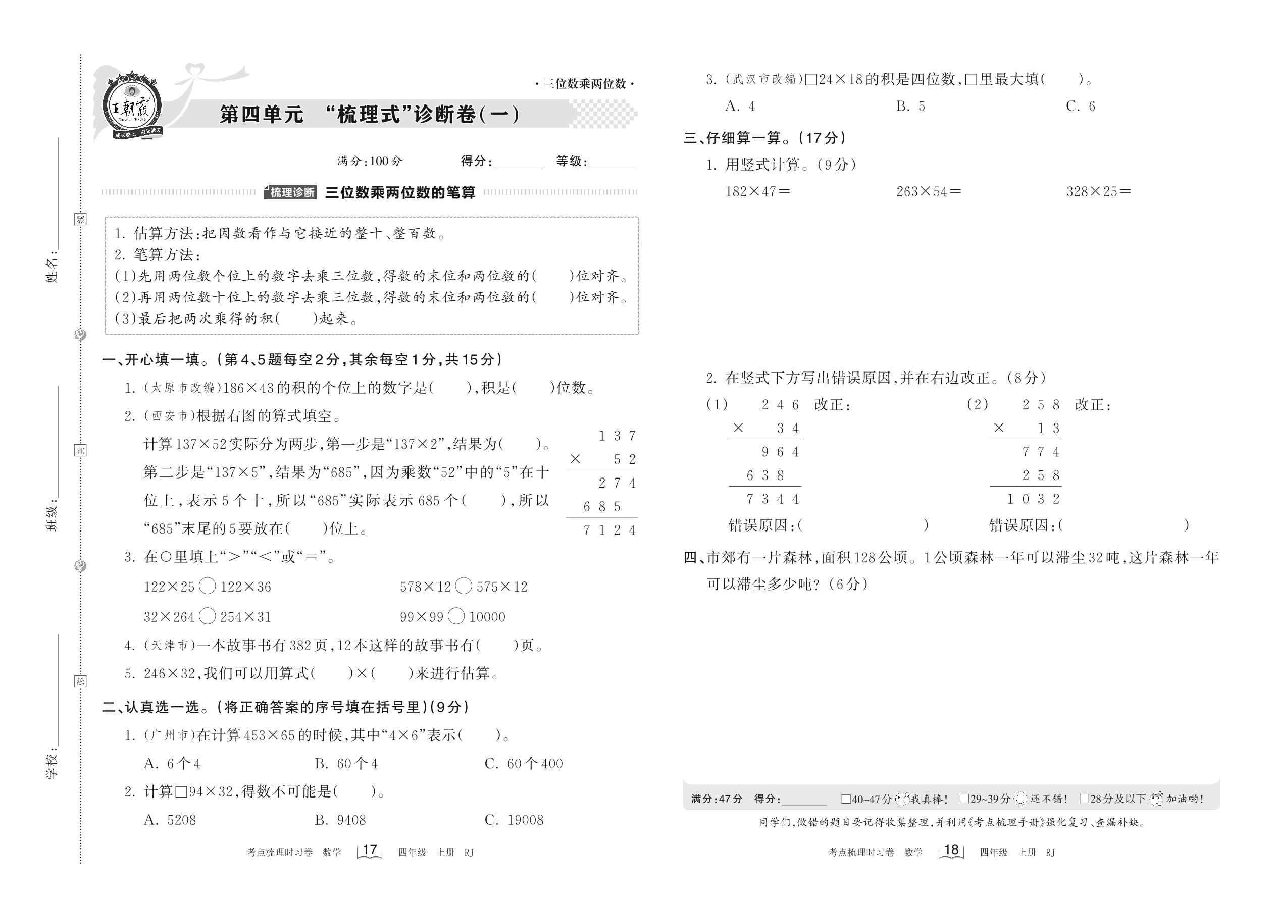 2022上册四年级数学人教版 第四单元 “梳理式”诊断卷(一)