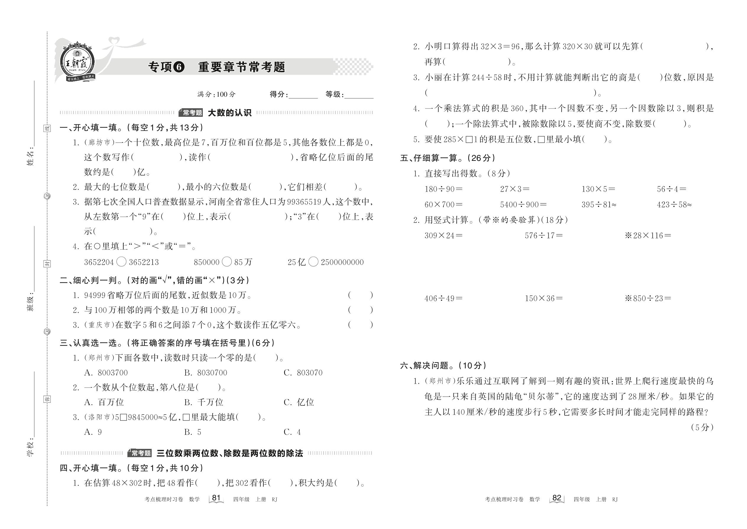 2022上册四年级数学人教版 专项6 重要章节常考题