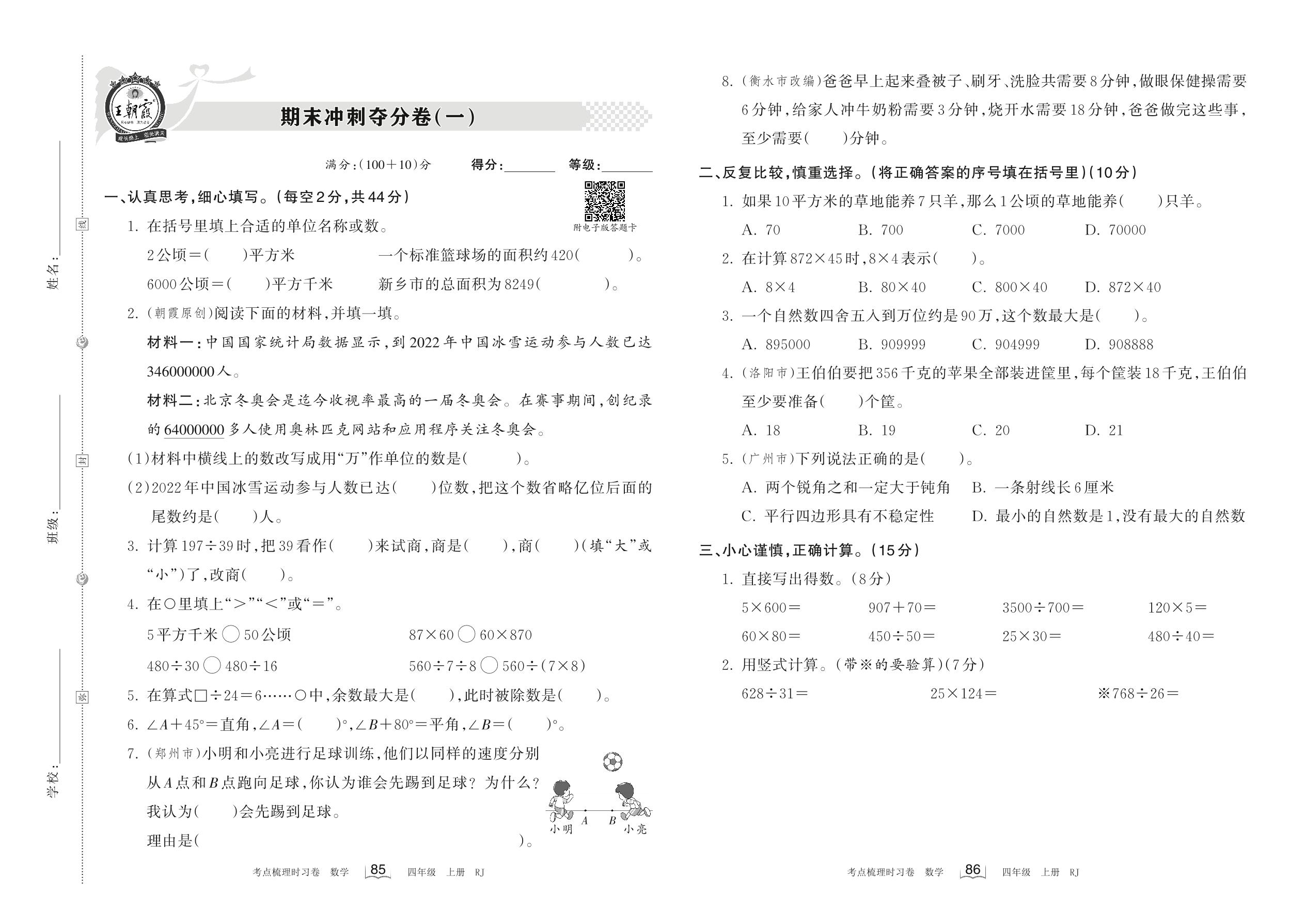 2022上册四年级数学人教版 期末冲刺夺分卷(一)