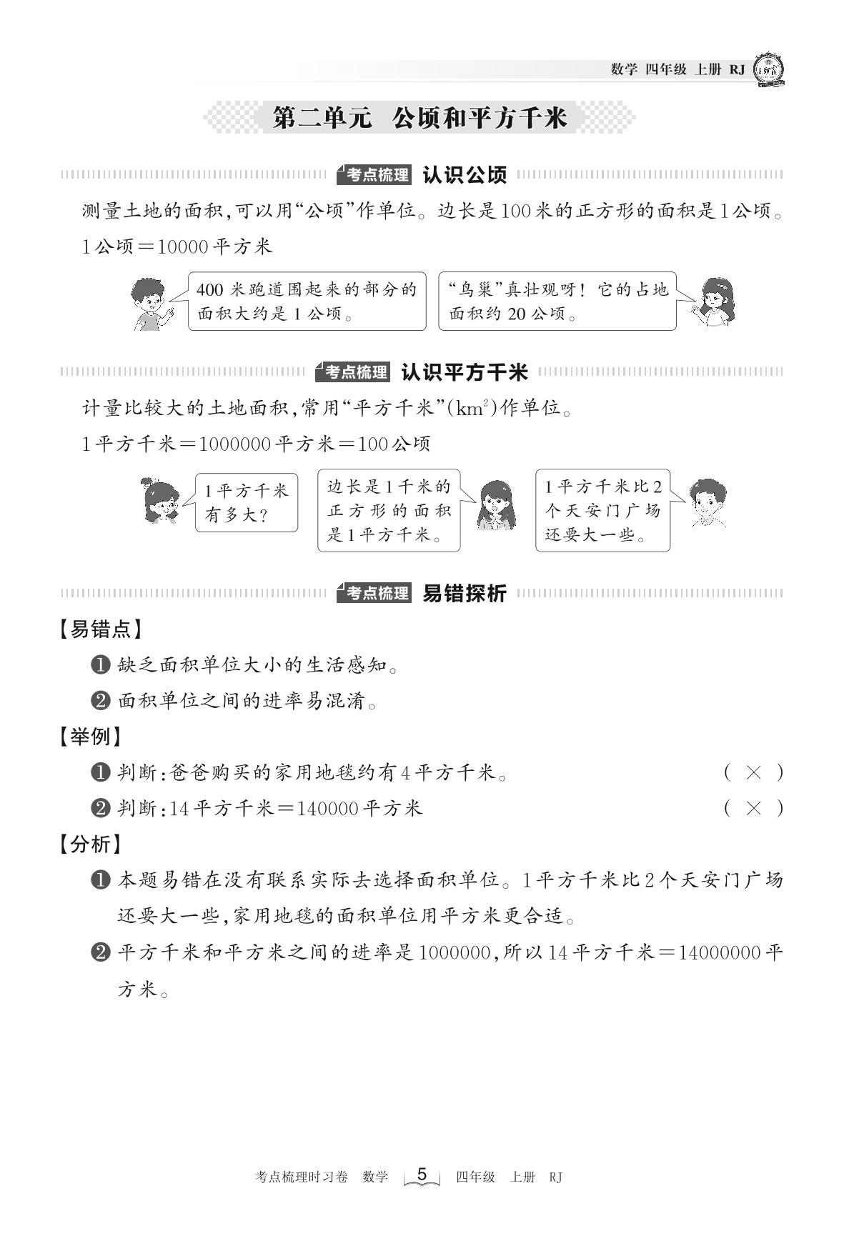 2022上册四年级数学人教版 考点梳理手册——第二单元 公顷和平方千米