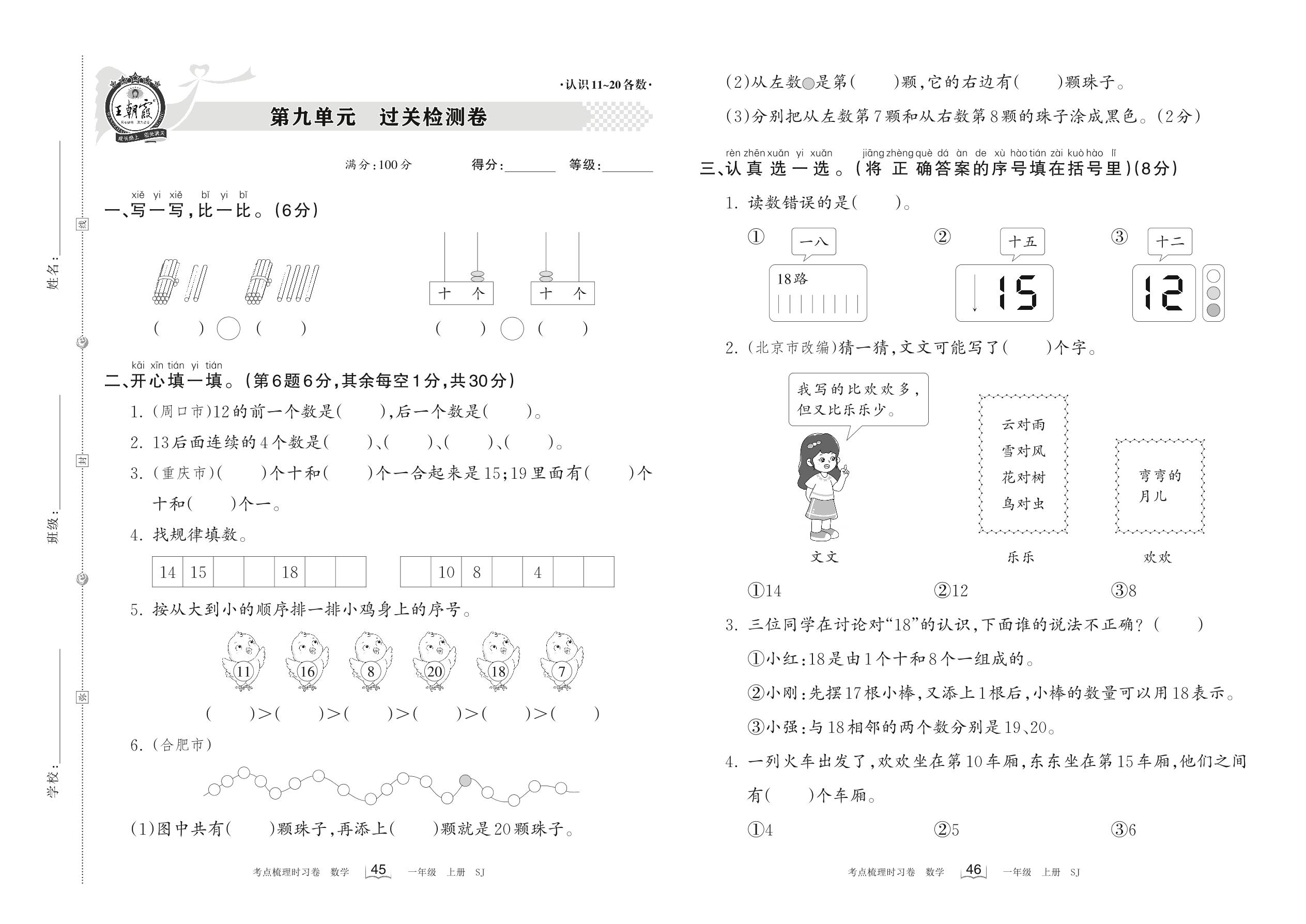 2022上册一年级数学苏教版 第九单元 过关检测卷