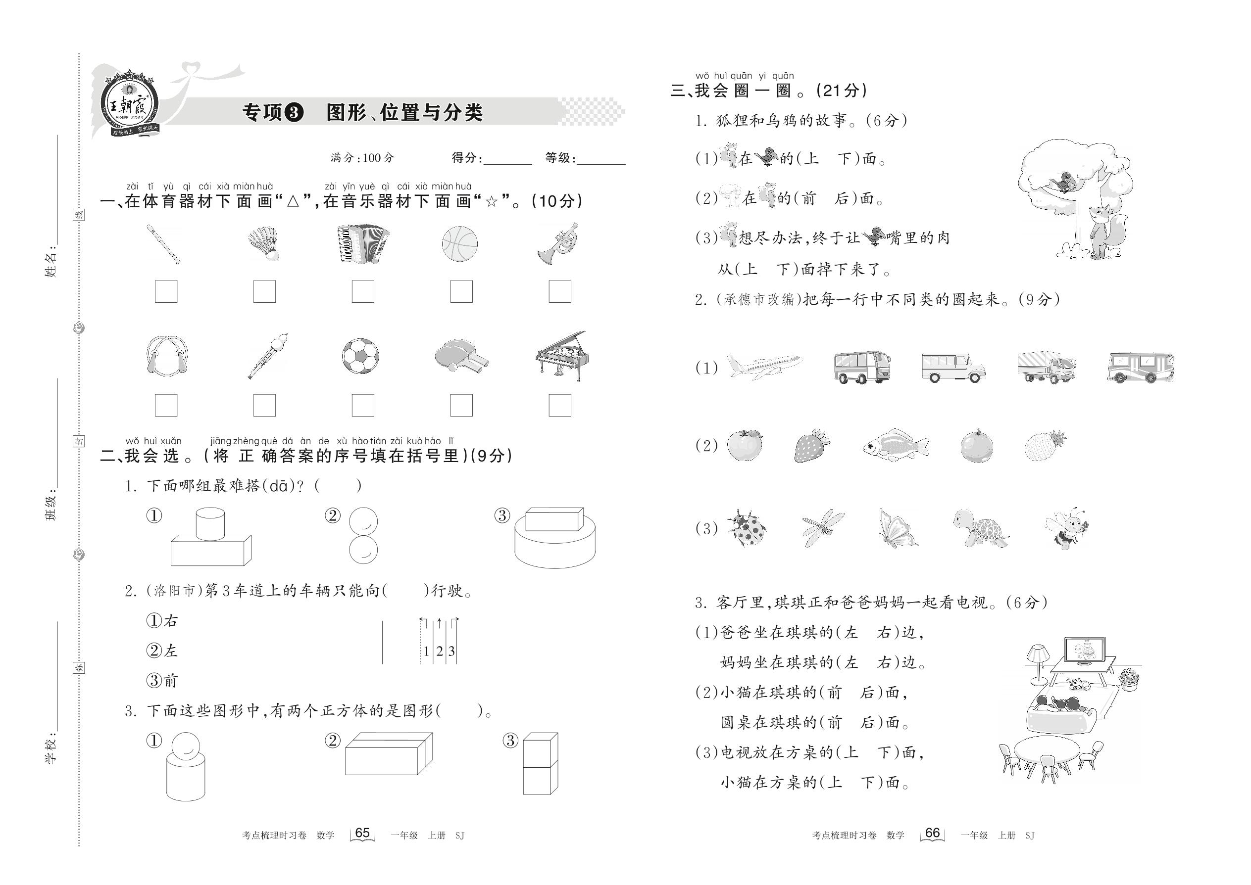 2022上册一年级数学苏教版 专项3 图形、位置与分类