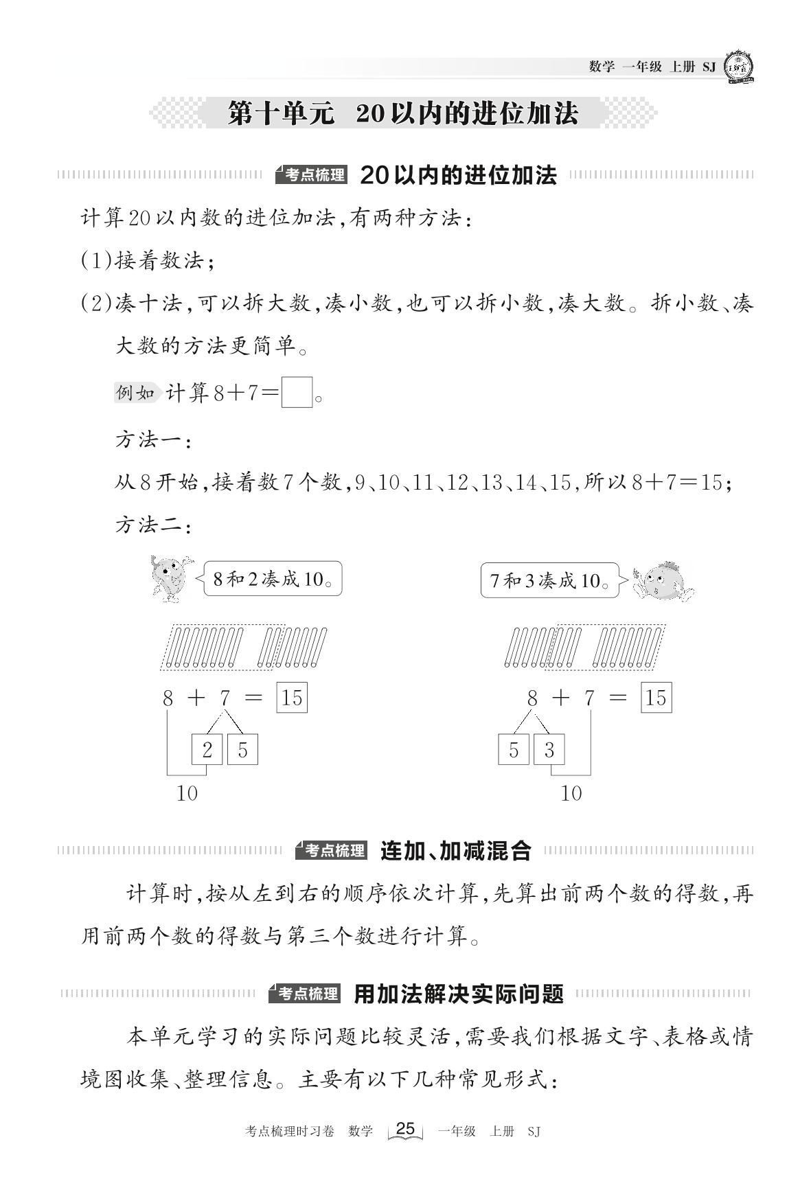 2022上册一年级数学苏教版 考点梳理手册——第十单元 20以内的进位加法