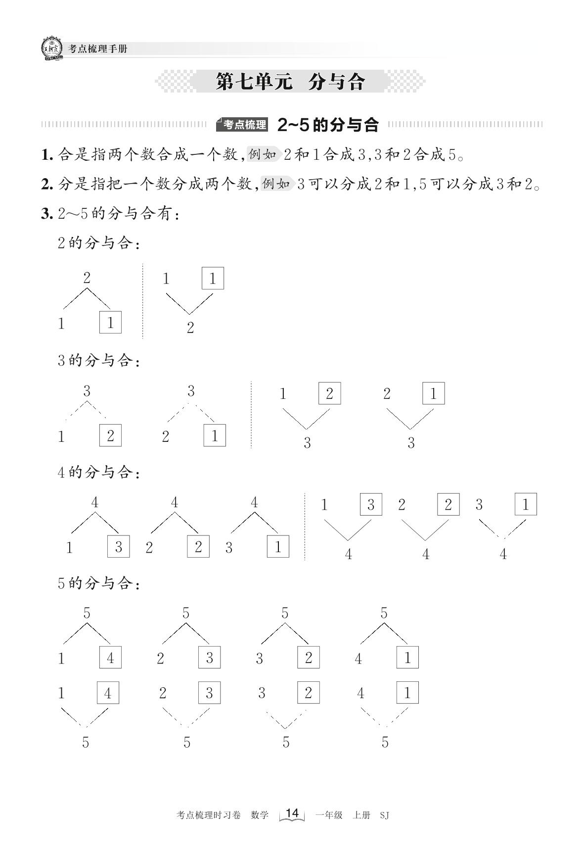 2022上册一年级数学苏教版 考点梳理手册——第七单元 分与合