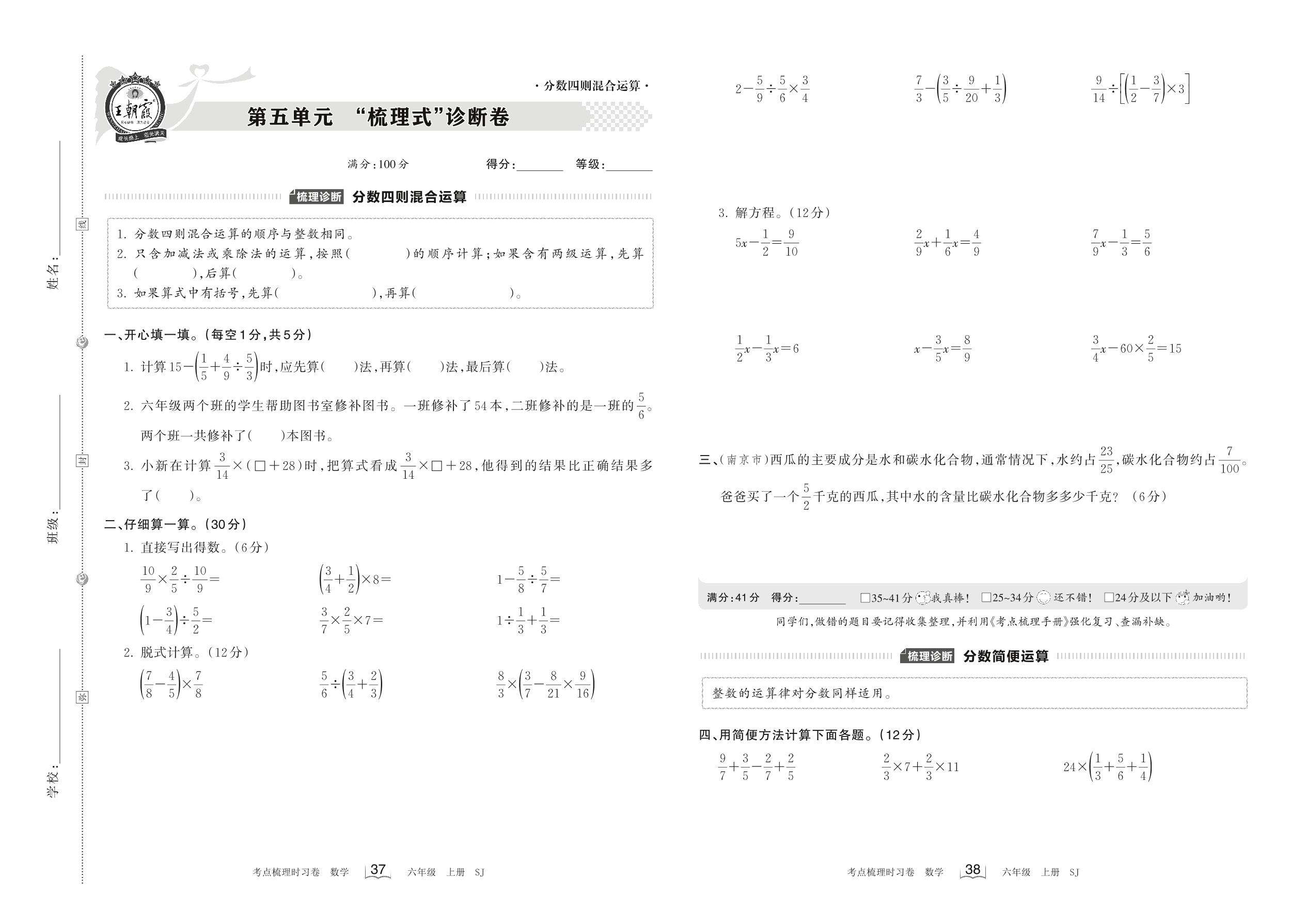 2022上册六年级数学苏教版 第五单元 “梳理式”诊断卷