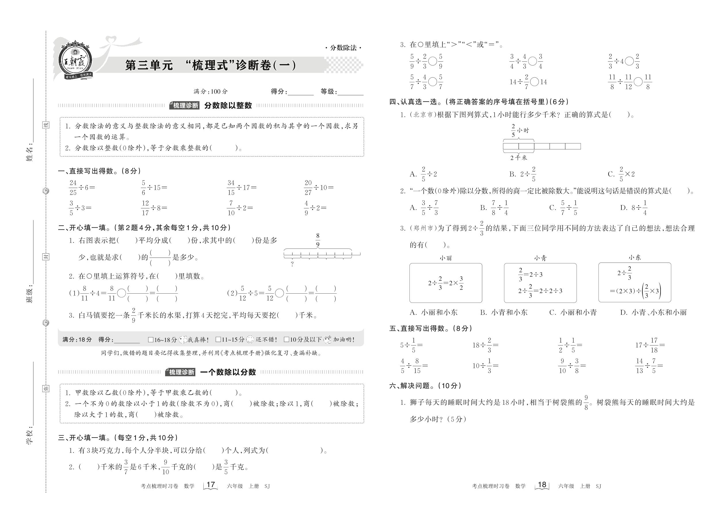 2022上册六年级数学苏教版 第三单元 “梳理式”诊断卷(一)