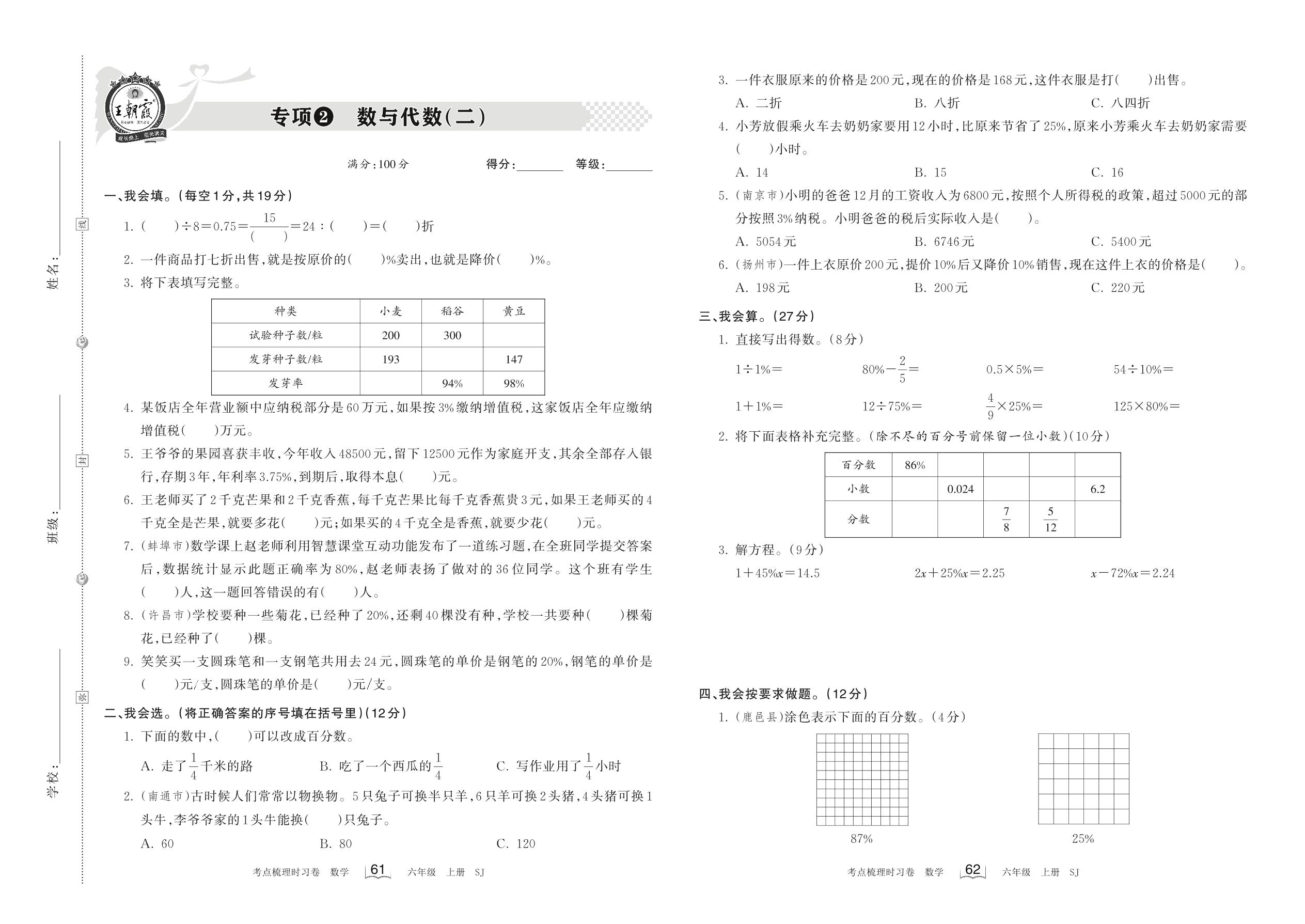 2022上册六年级数学苏教版 专项2 数与代数(二)