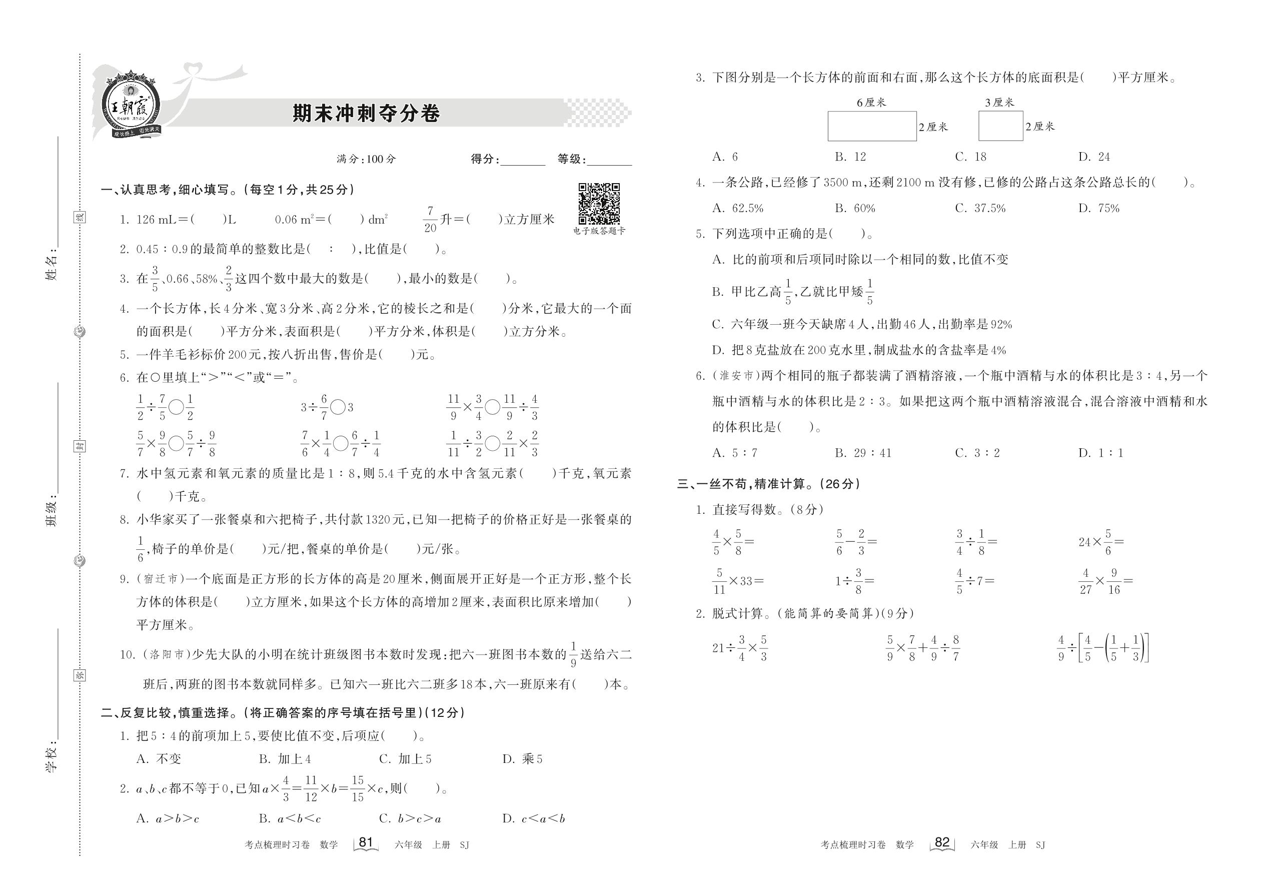 2022上册六年级数学苏教版 期末冲刺夺分卷