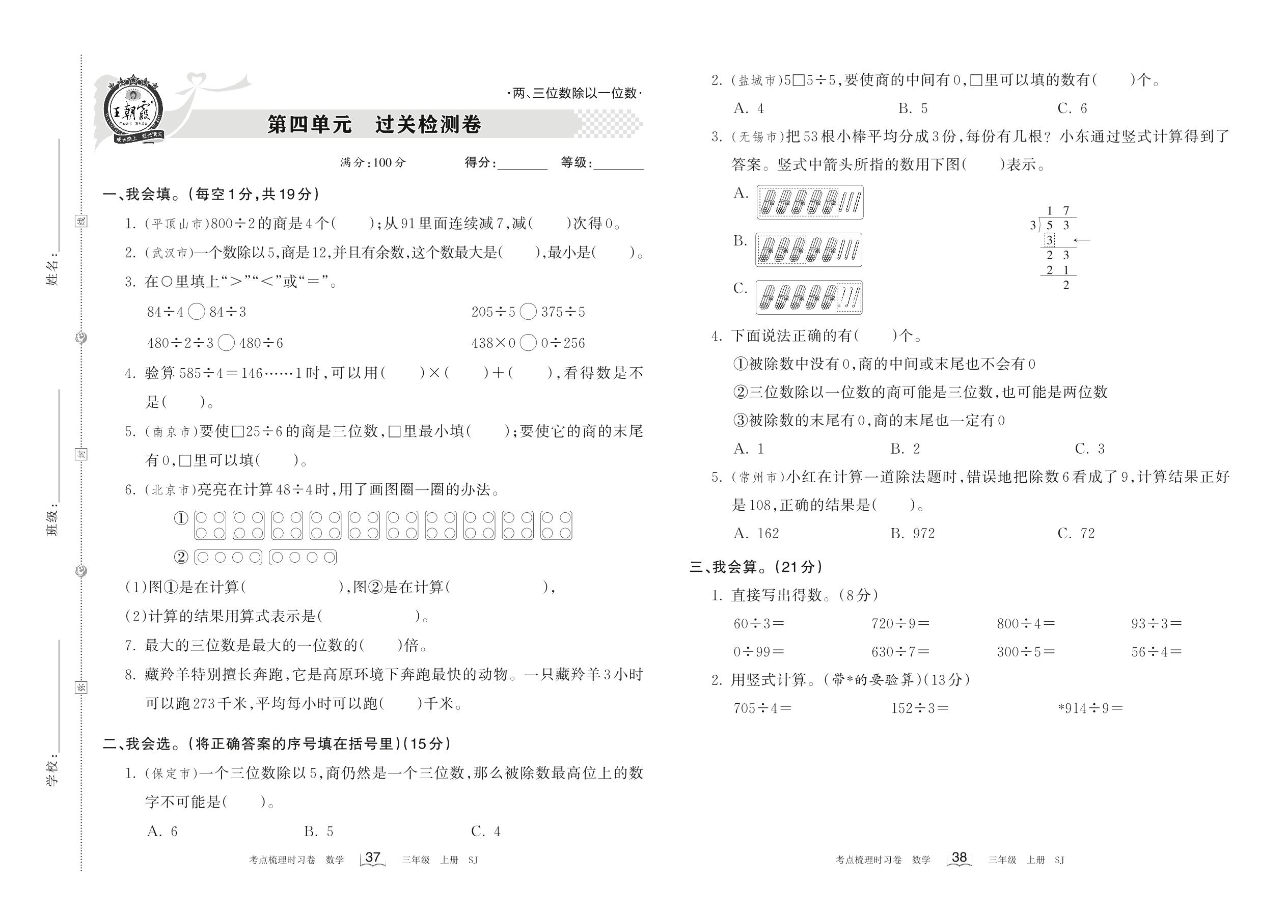 2022上册三年级数学苏教版 第四单元 过关检测卷