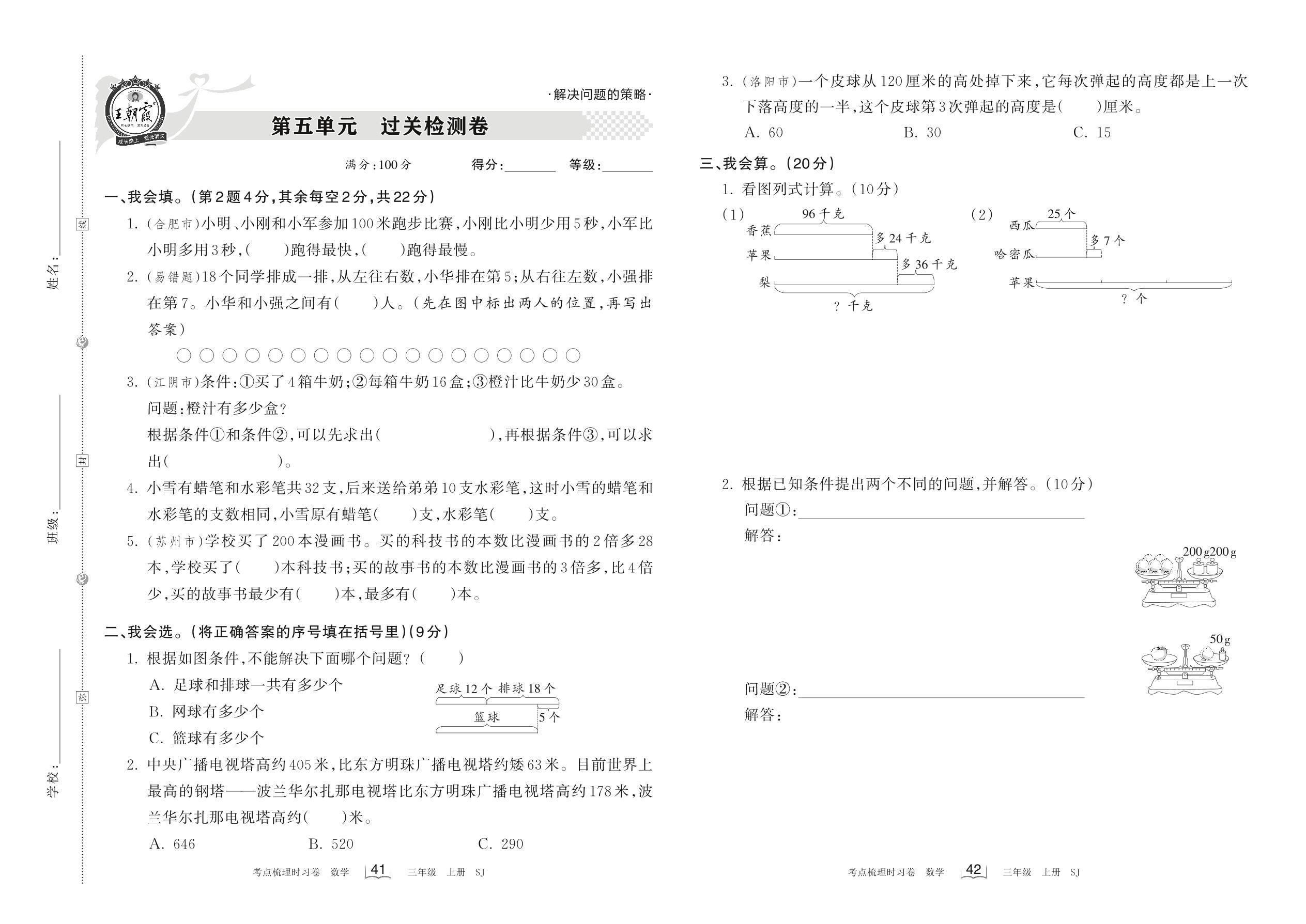 2022上册三年级数学苏教版 第五单元 过关检测卷