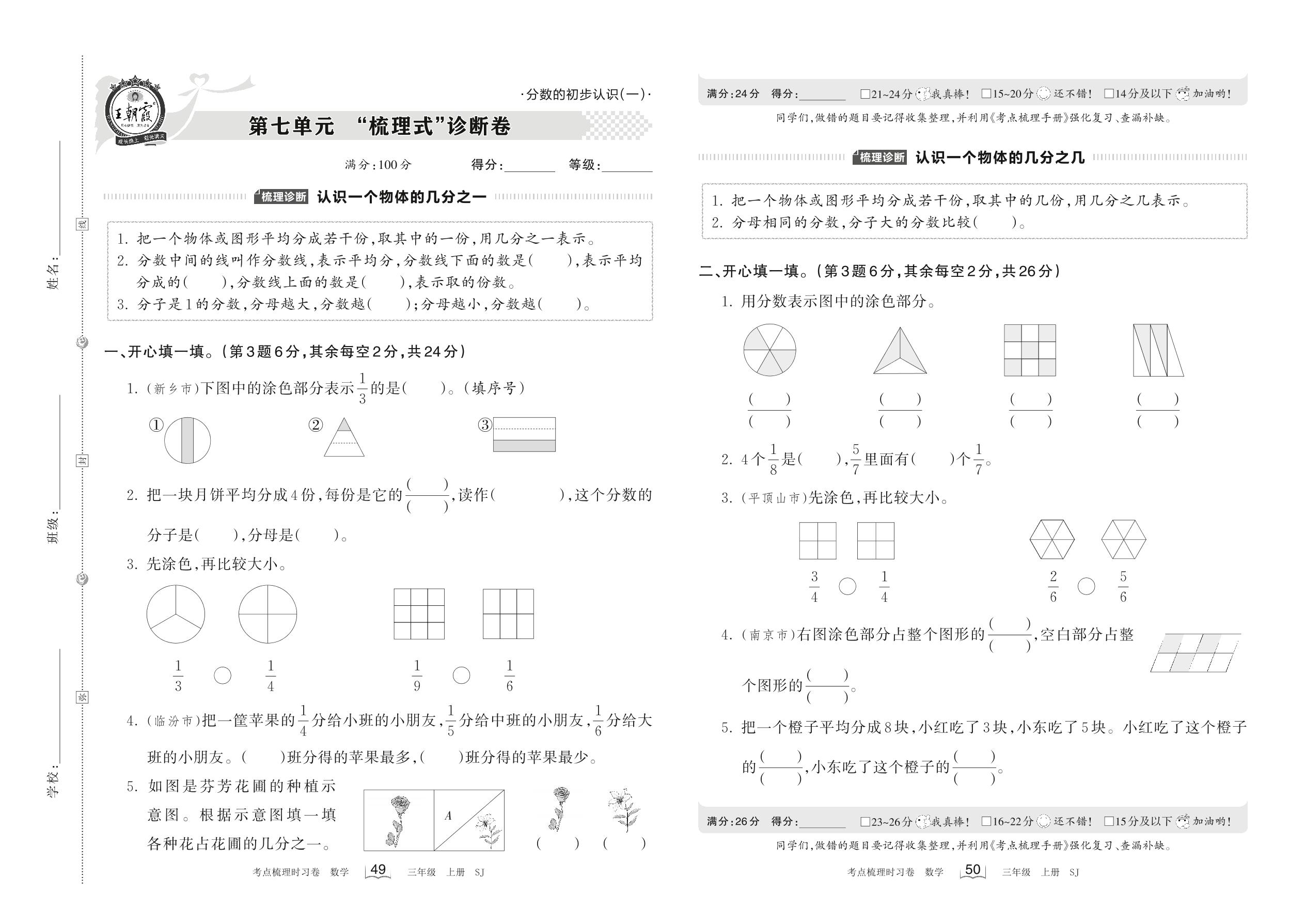 2022上册三年级数学苏教版 第七单元 “梳理式”诊断卷