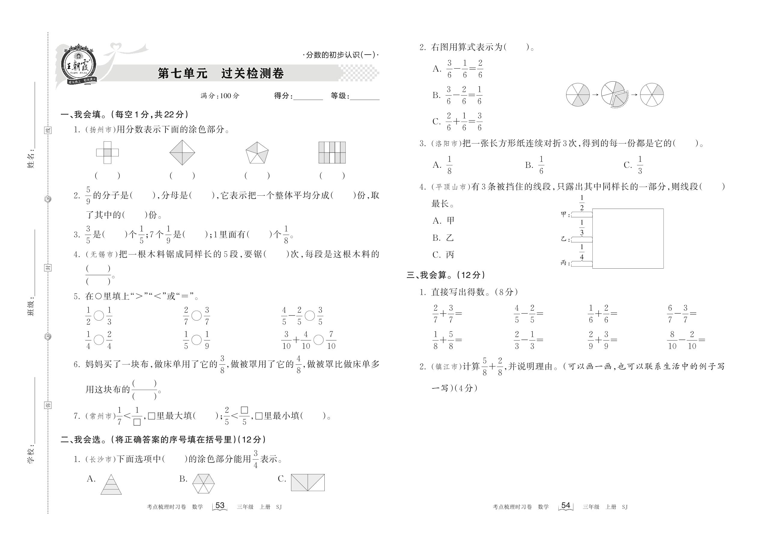 2022上册三年级数学苏教版 第七单元 过关检测卷