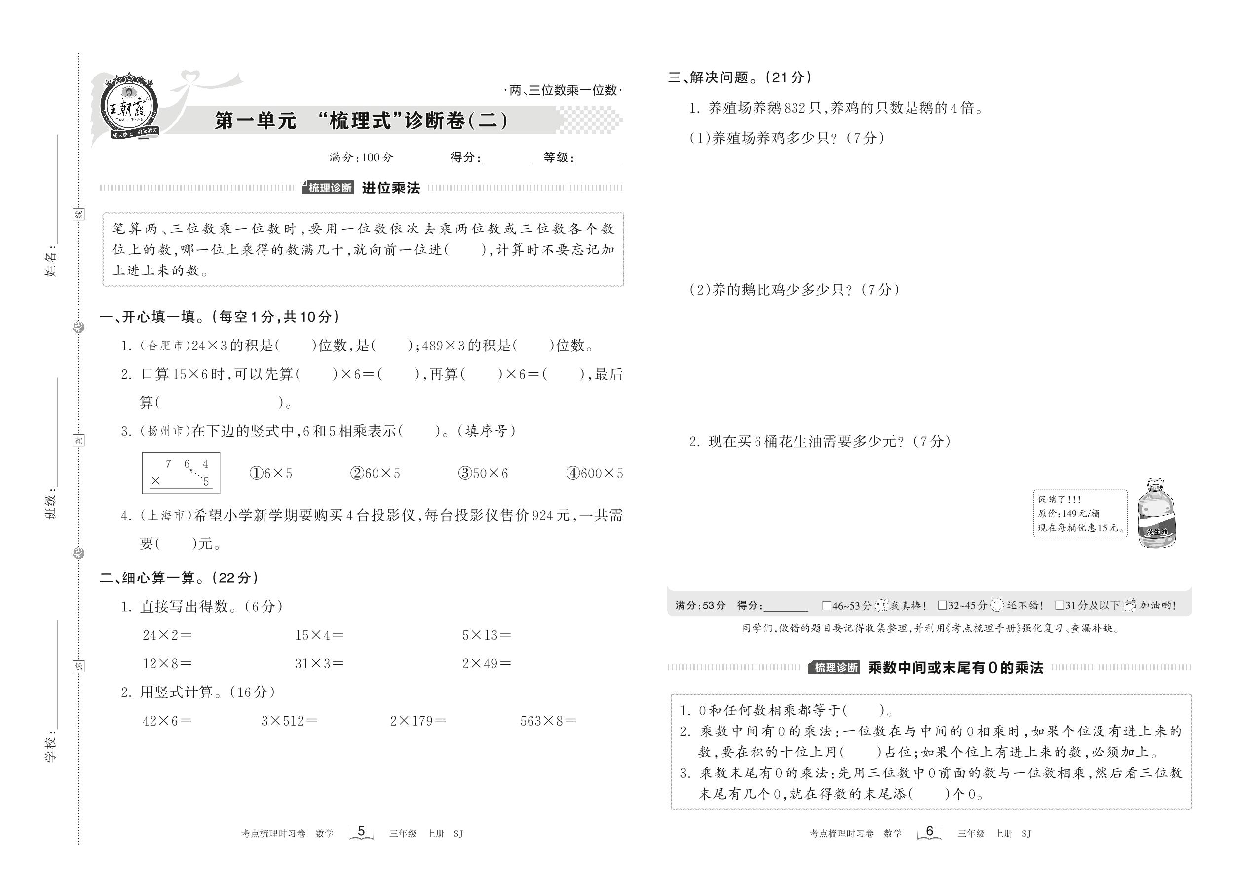 2022上册三年级数学苏教版 第一单元 “梳理式”诊断卷(二)