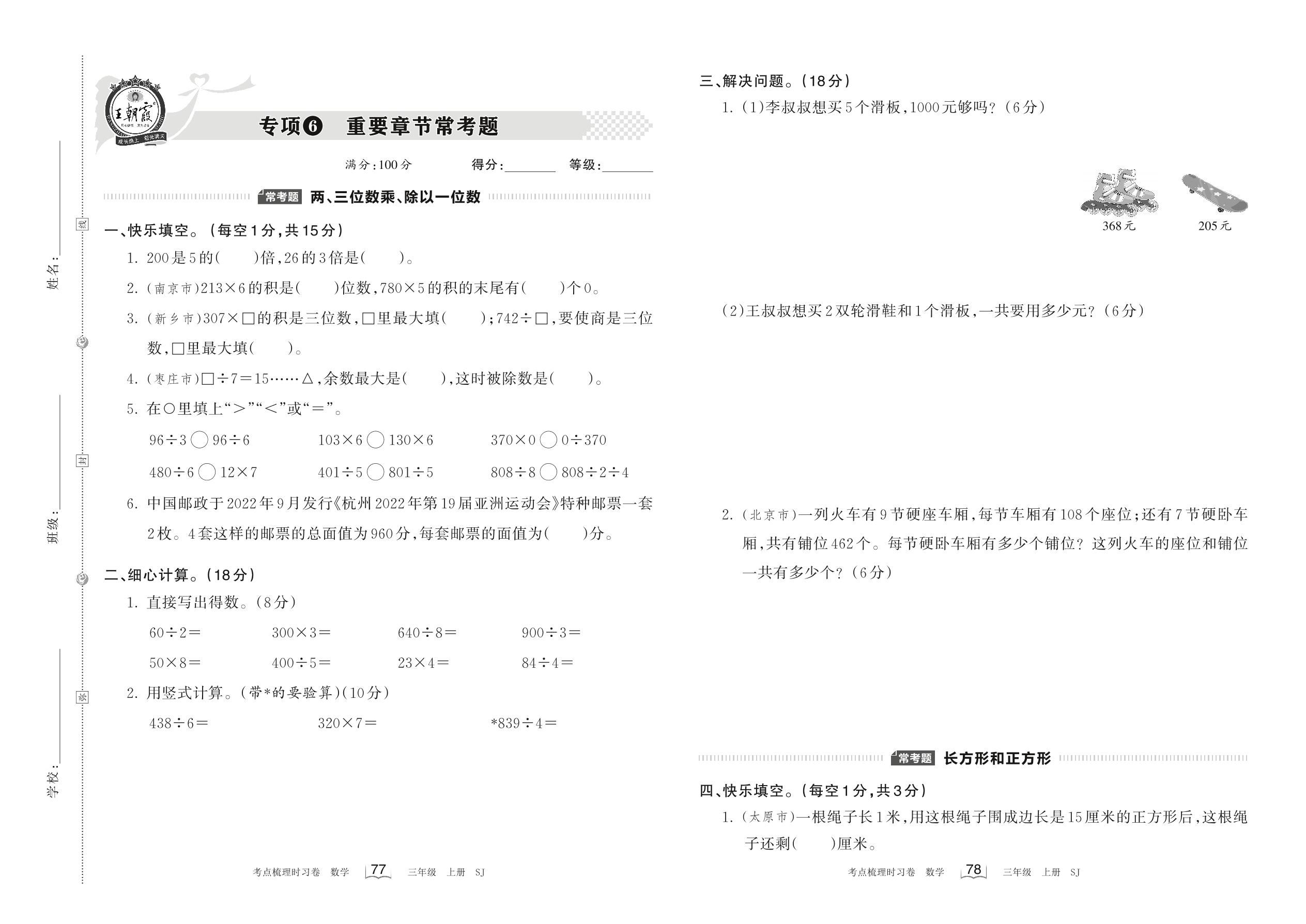2022上册三年级数学苏教版 专项6 重要章节常考题