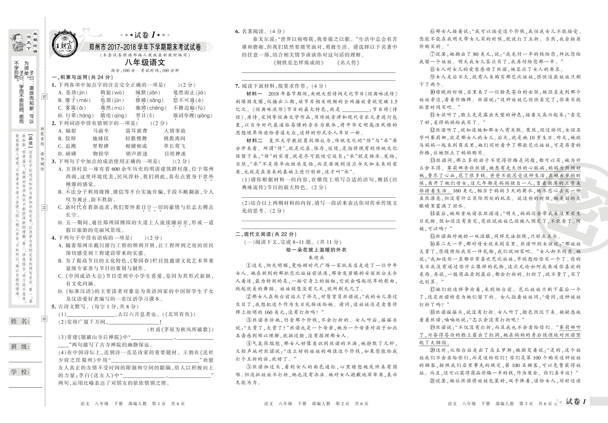 2017-2018学年第二学期郑州市八年级语文试卷(人教版)_R21080242755【1】