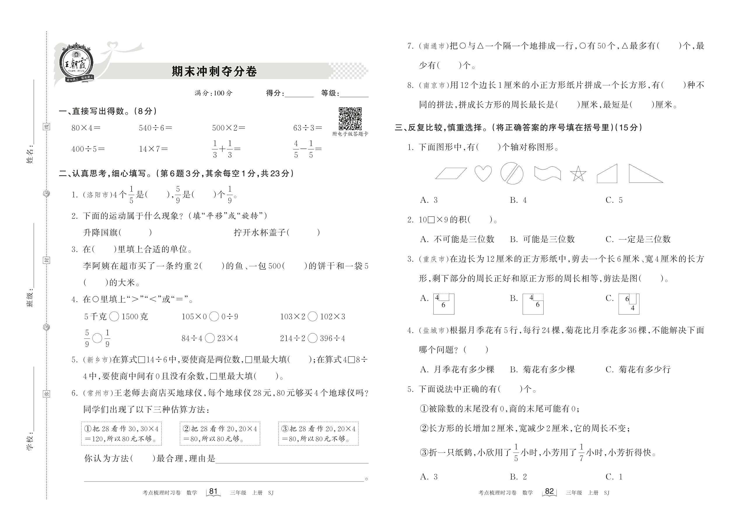 2022上册三年级数学苏教版 期末冲刺夺分卷