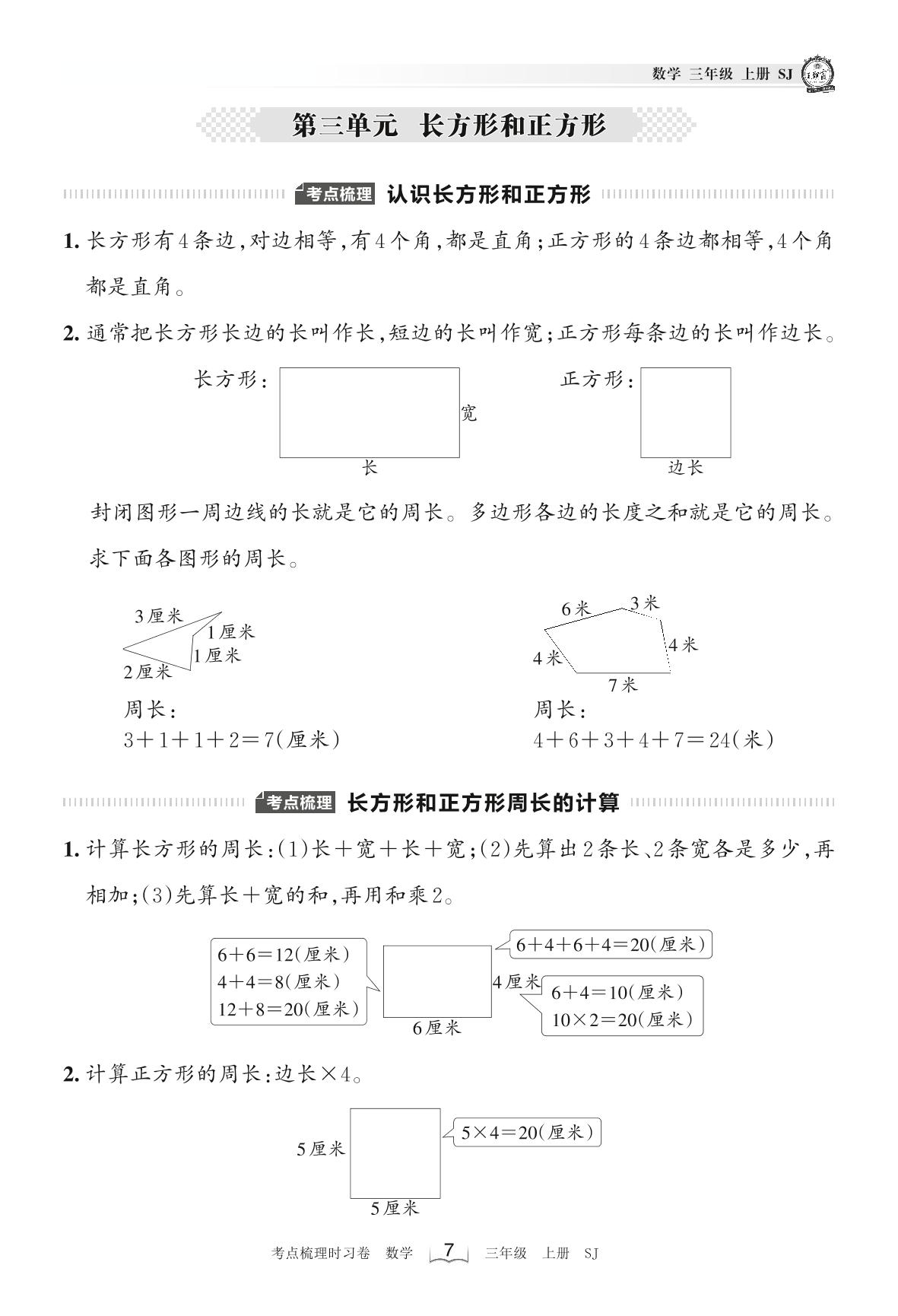 2022上册三年级数学苏教版 考点梳理手册——第三单元 长方形和正方形