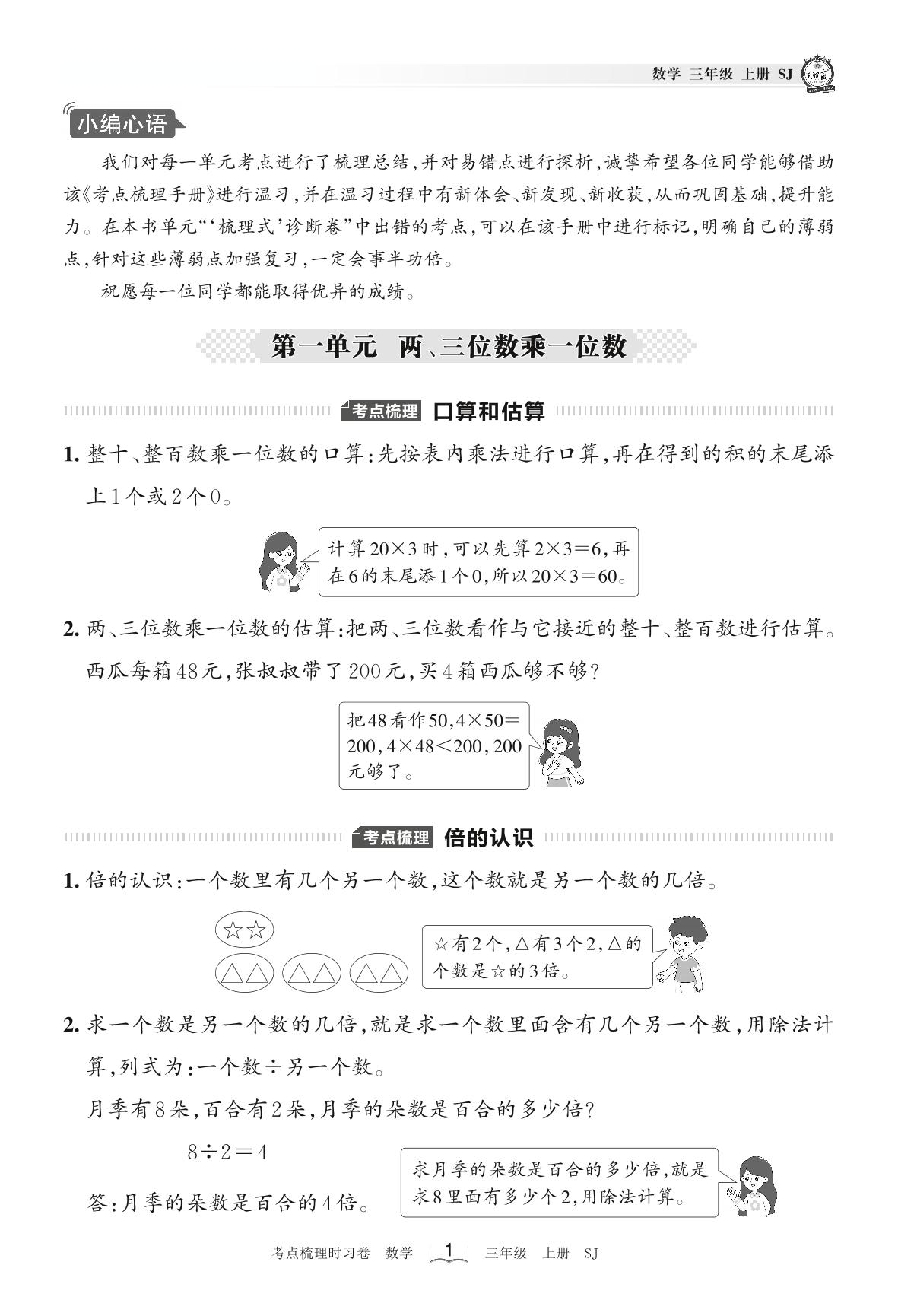 2022上册三年级数学苏教版 考点梳理手册——第一单元 两、三位数乘一位数