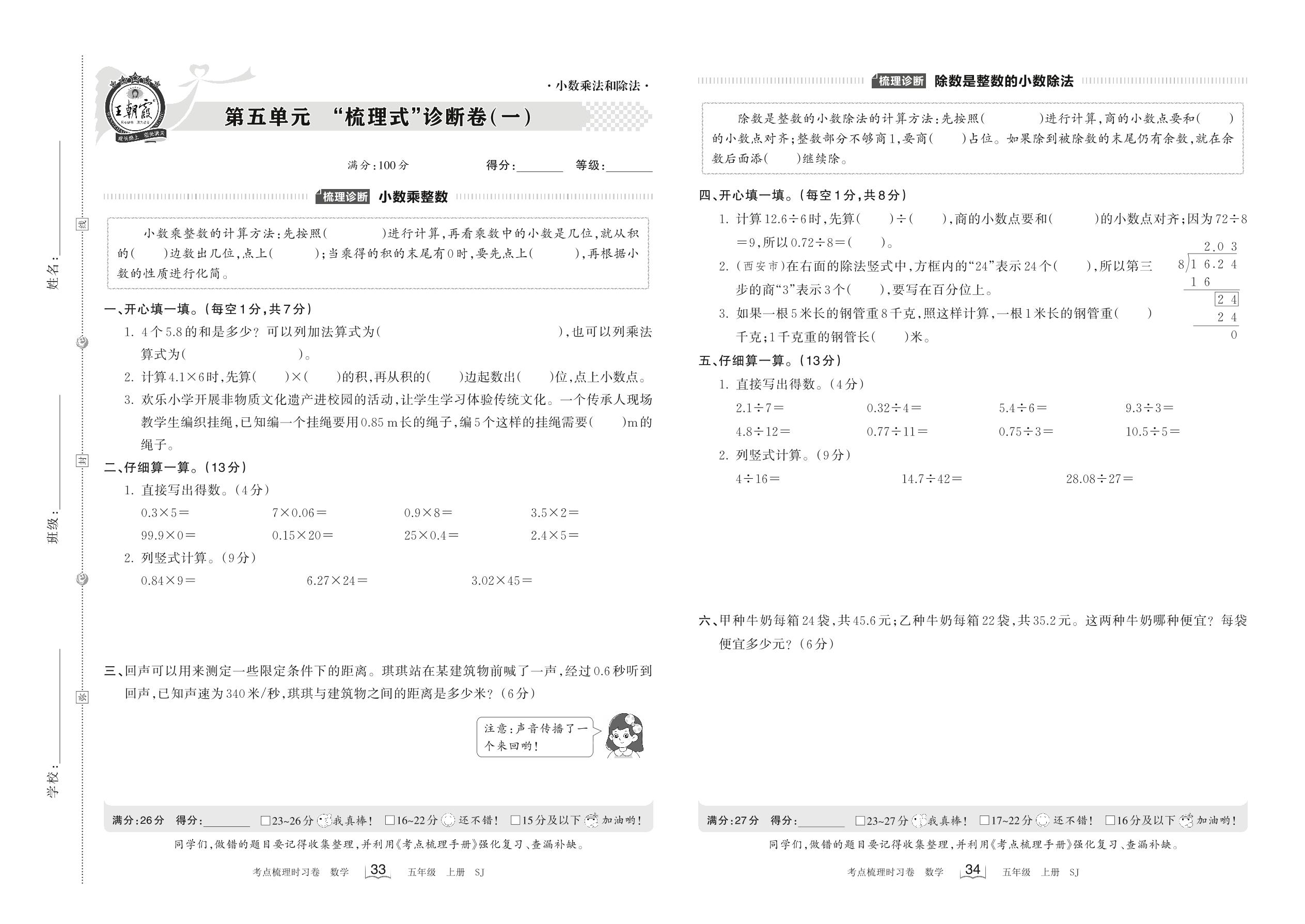2022上册五年级数学苏教版 第五单元 “梳理式”诊断卷(一)