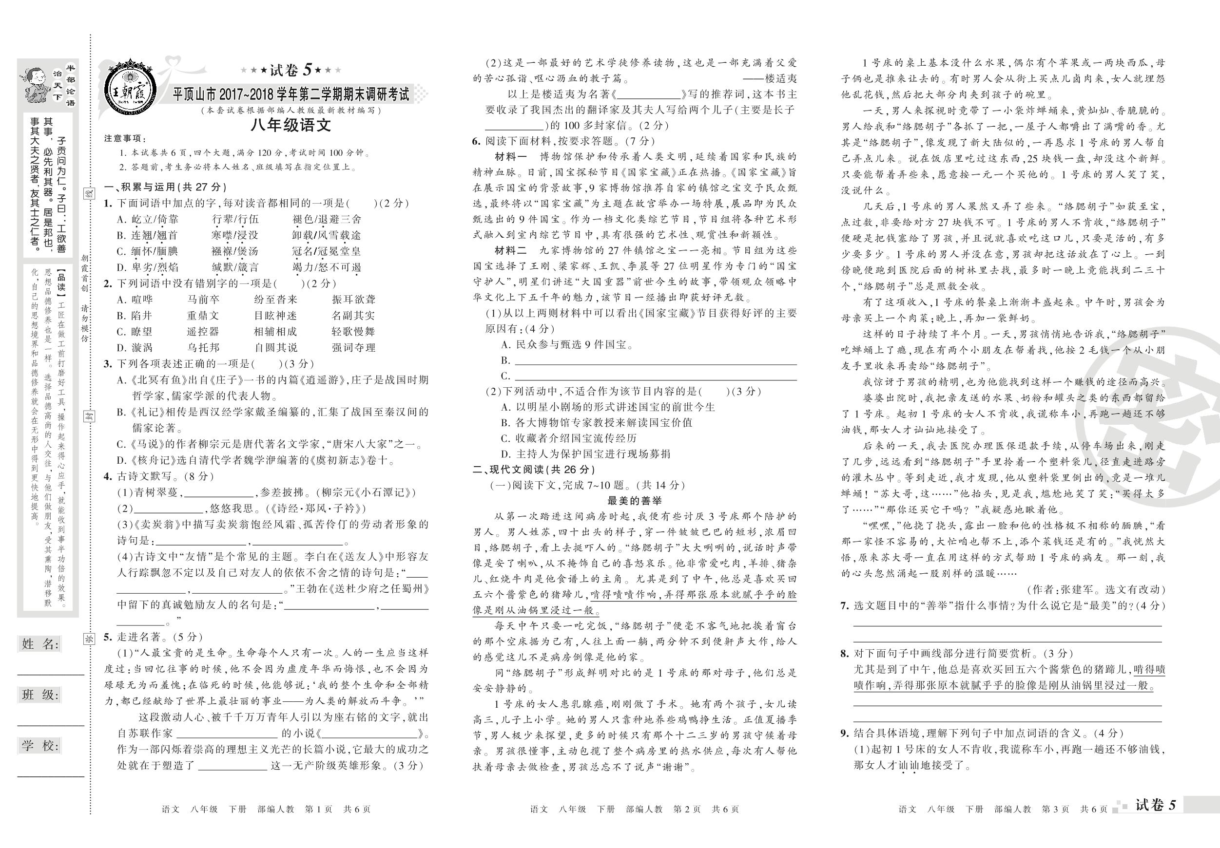 2017-2018学年第二学期平顶山市八年级语文试卷(人教版)【5】