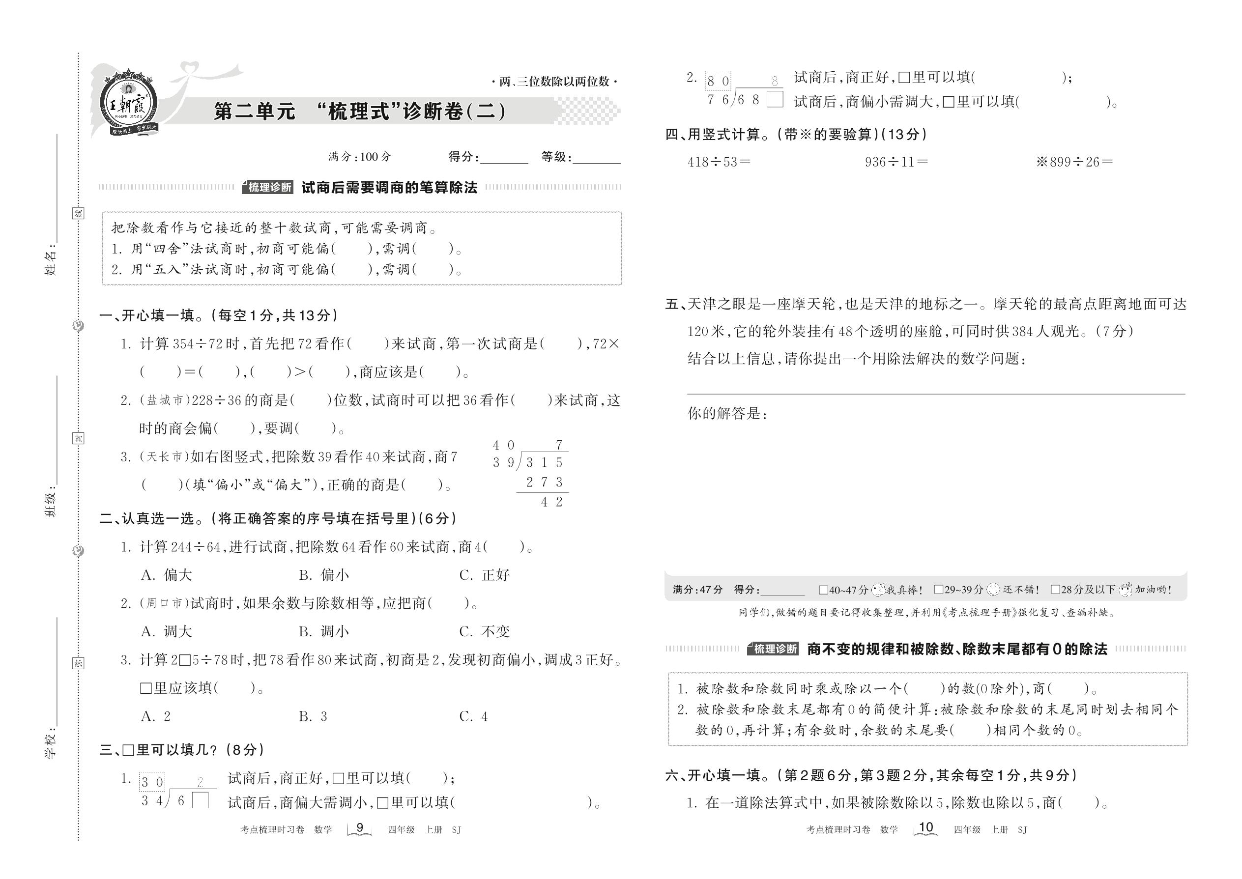 2022上册四年级数学苏教版 第二单元 “梳理式”诊断卷(二)