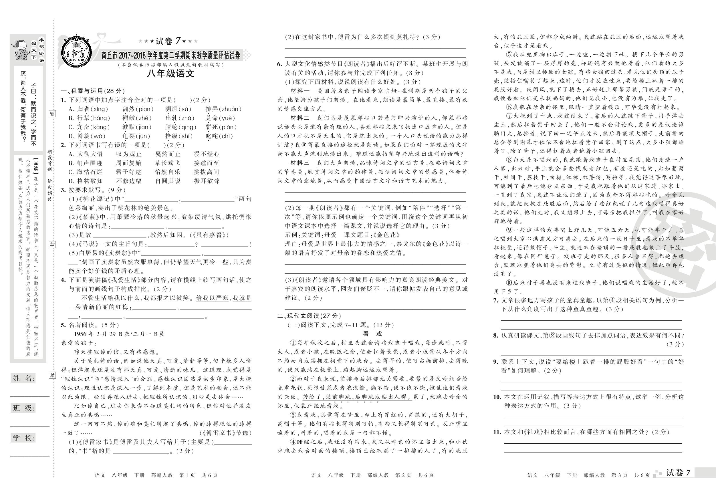 2017-2018学年第二学期商丘市八年级语文试卷(人教版)【7】