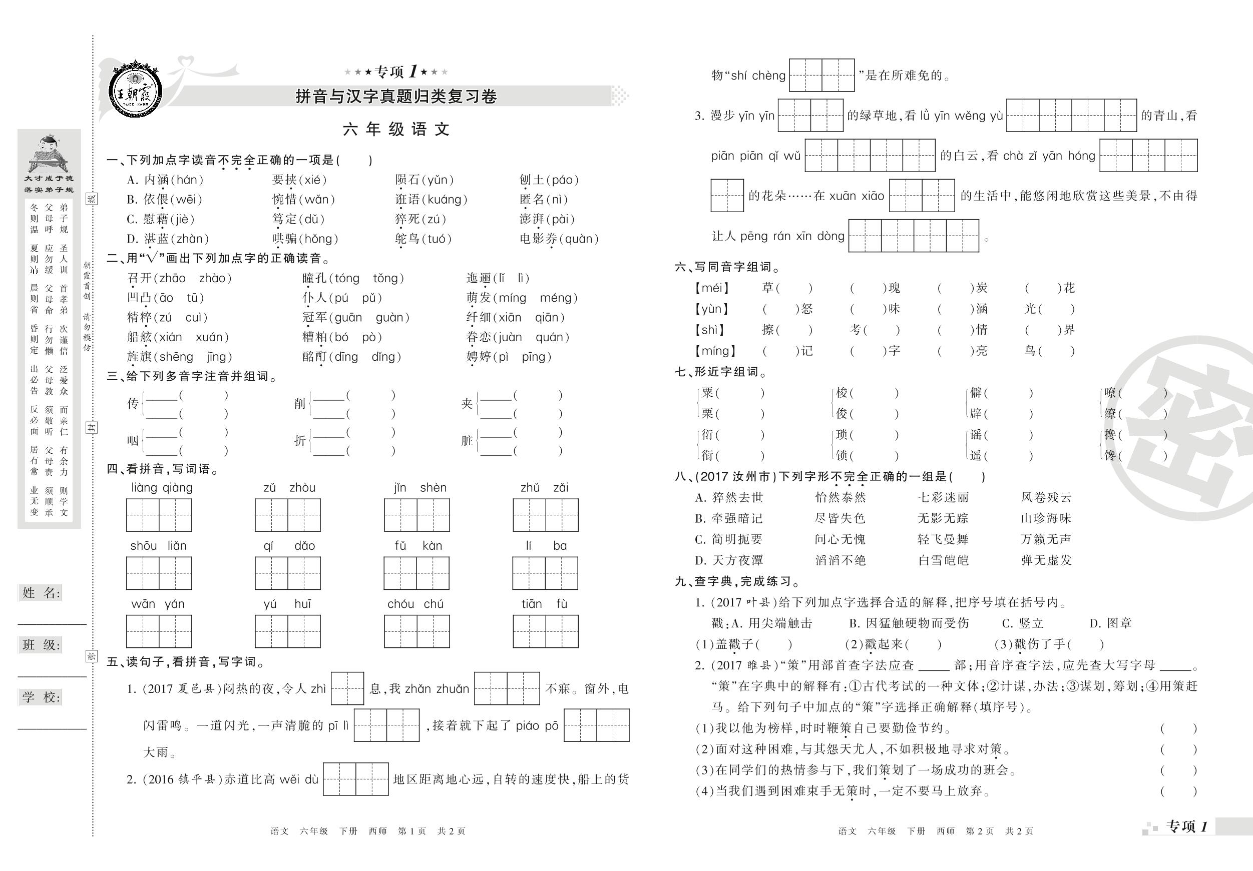 王朝霞期末专项卷——拼音与汉字、词语真题归类复习卷六年级下册语文(西师版)_R21080242952【0】