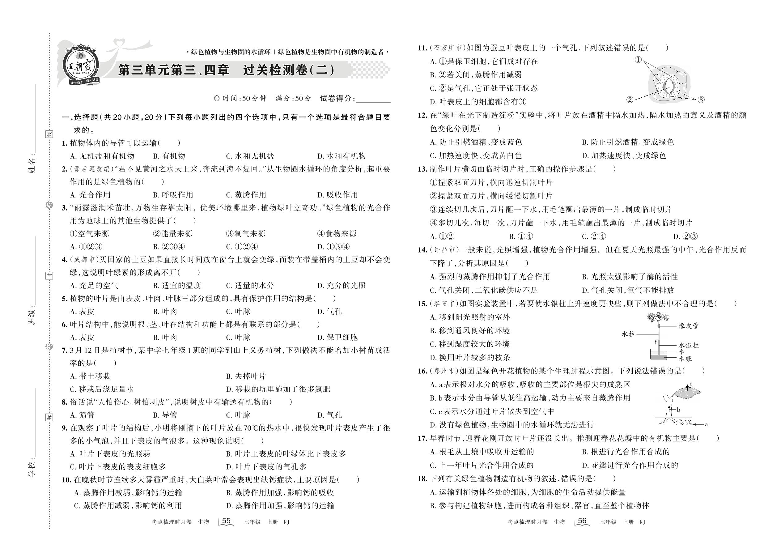 2022上册七年级生物人教版 第三单元第三、四章 过关检测卷(二)