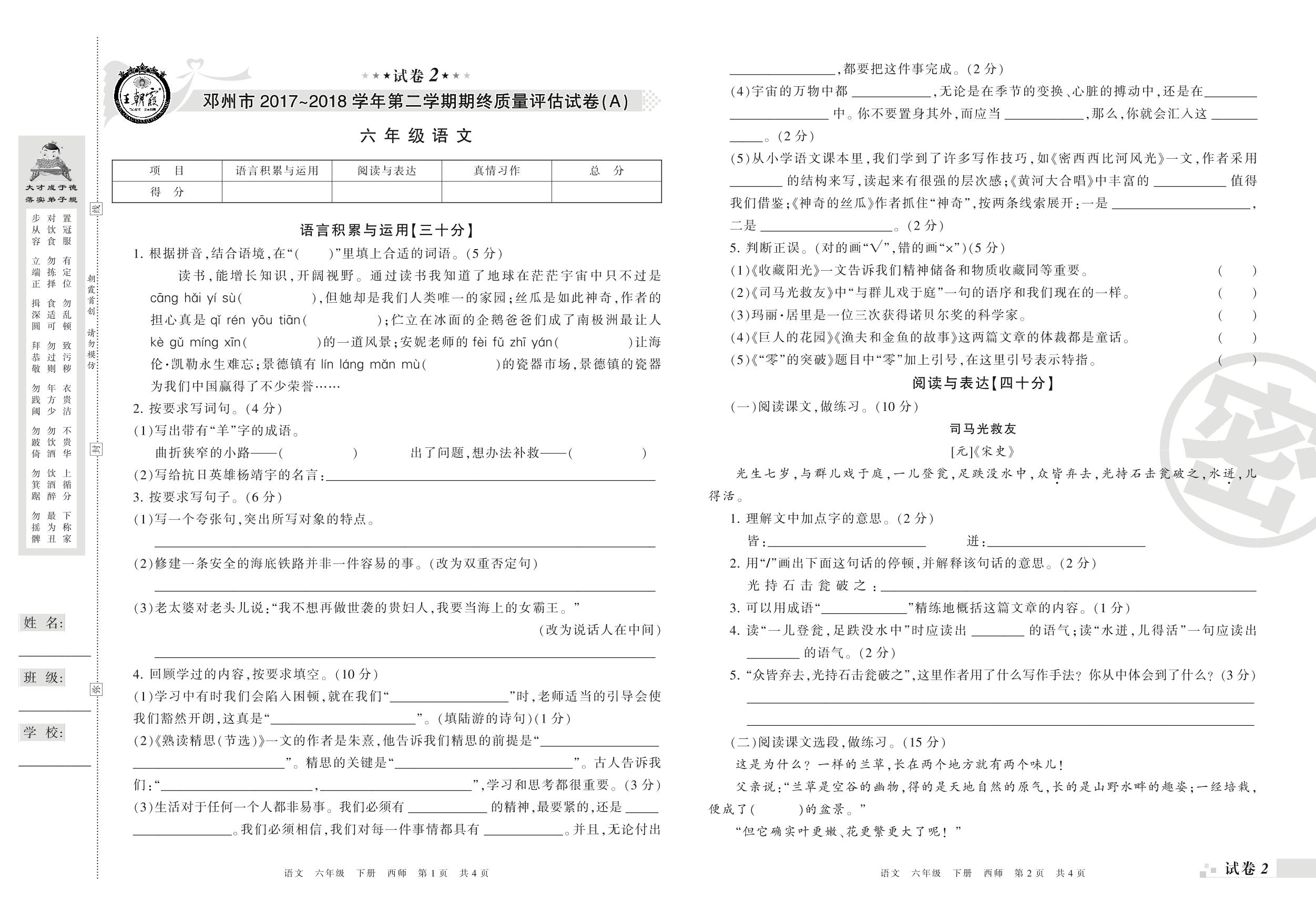 2017-2018学年第二学期邓州市六年级语文试卷(西师版)【2】